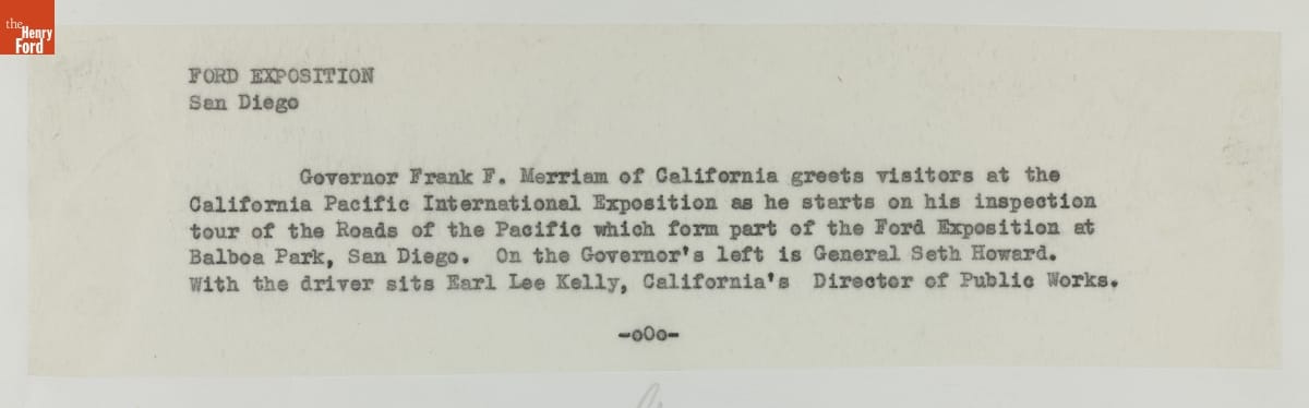 The Ford Exhibit at the 1935 California Pacific International Exposition featured "Roads of the Pacific," where visitors rode in brand new Ford V-8s over realistic reproductions of historic and modern roadways. In this photograph, California's governor (with hat raised), director of public works (next to driver), and adjutant general set out for an inspection tour of Ford's immersive experience.