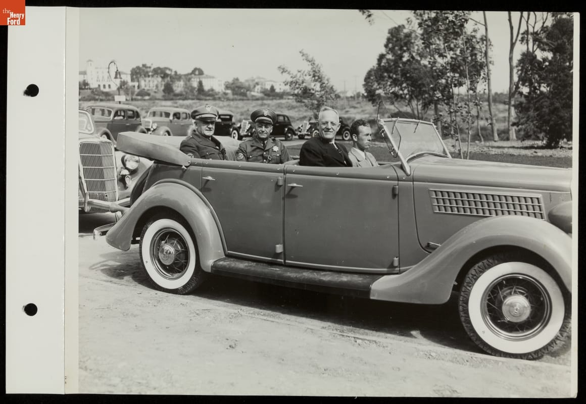 The Ford Exhibit at the 1935 California Pacific International Exposition featured "Roads of the Pacific," where visitors rode in brand new Ford V-8s over realistic reproductions of 14 historic and modern roadways. In this photograph, a group of distinguished visitors sets out for a tour of Ford's immersive "Roads of the Pacific" experience.