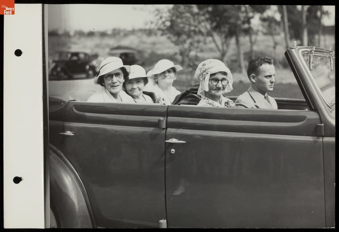 The Ford Exhibit -- the most popular attraction at the 1935 California Pacific International Exposition -- featured "Roads of the Pacific," where visitors rode in brand new Ford V-8s over realistic reproductions of historic and modern roadways. This photograph shows four women setting out to tour the 14 sections comprising the "Roads of the Pacific" experience.