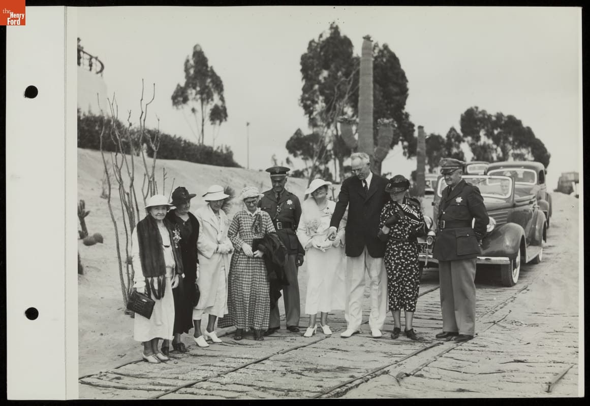 The Ford building -- the most popular attraction at the 1935 California Pacific International Exposition -- featured "Roads of the Pacific." Visitors rode in brand new Ford V-8s over 14 realistic reproductions of historic and modern roadways. This photograph shows tourists examining a recreated section of a plank road that negotiated sand dunes between Yuma, Arizona, and San Diego, California.