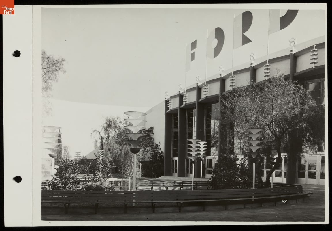 Resembling two engaged gears, Ford's steel, concrete, and glass exhibition building towered above more traditional structures at the 1935 California Pacific International Exposition. The Ford Building -- created in the "Streamline Moderne" architectural style by industrial design pioneer Walter Dorwin Teague -- combined clean curves and sharp lines with modern materials, reflecting technological progress in the new machine age.