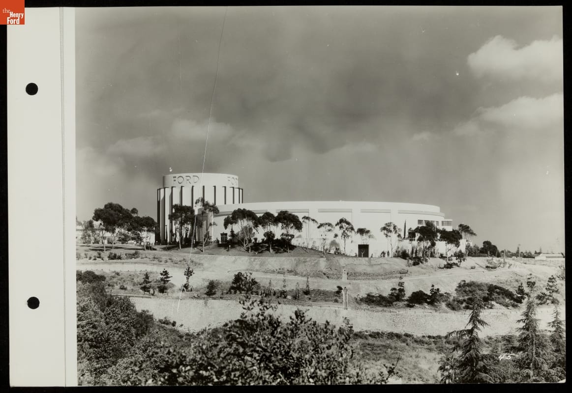 "Roads of the Pacific" was part of the Ford Exhibit, the most popular attraction at the 1935 California Pacific International Exposition. Visitors to the experience rode in brand new Ford V-8s over 14 reproductions of historic and modern roadways. This photograph shows how the terraced "Roads of the Pacific" meandered around the Ford Building.