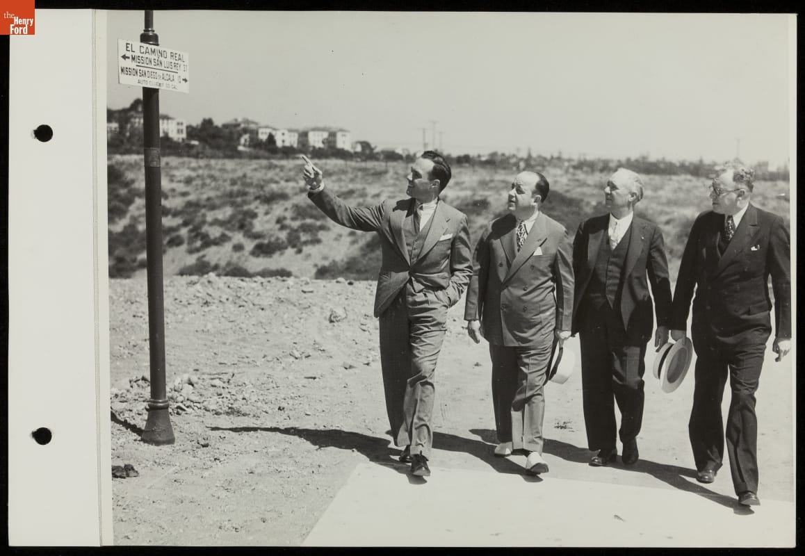 "Roads of the Pacific" was part of the Ford Exhibit, the most popular attraction at the 1935 California Pacific International Exposition. Most visitors to the experience rode in brand new Ford V-8s over 14 reproductions of historic and modern roadways. These men are walking near a representation of California's historic El Camino Real (The Royal Road).