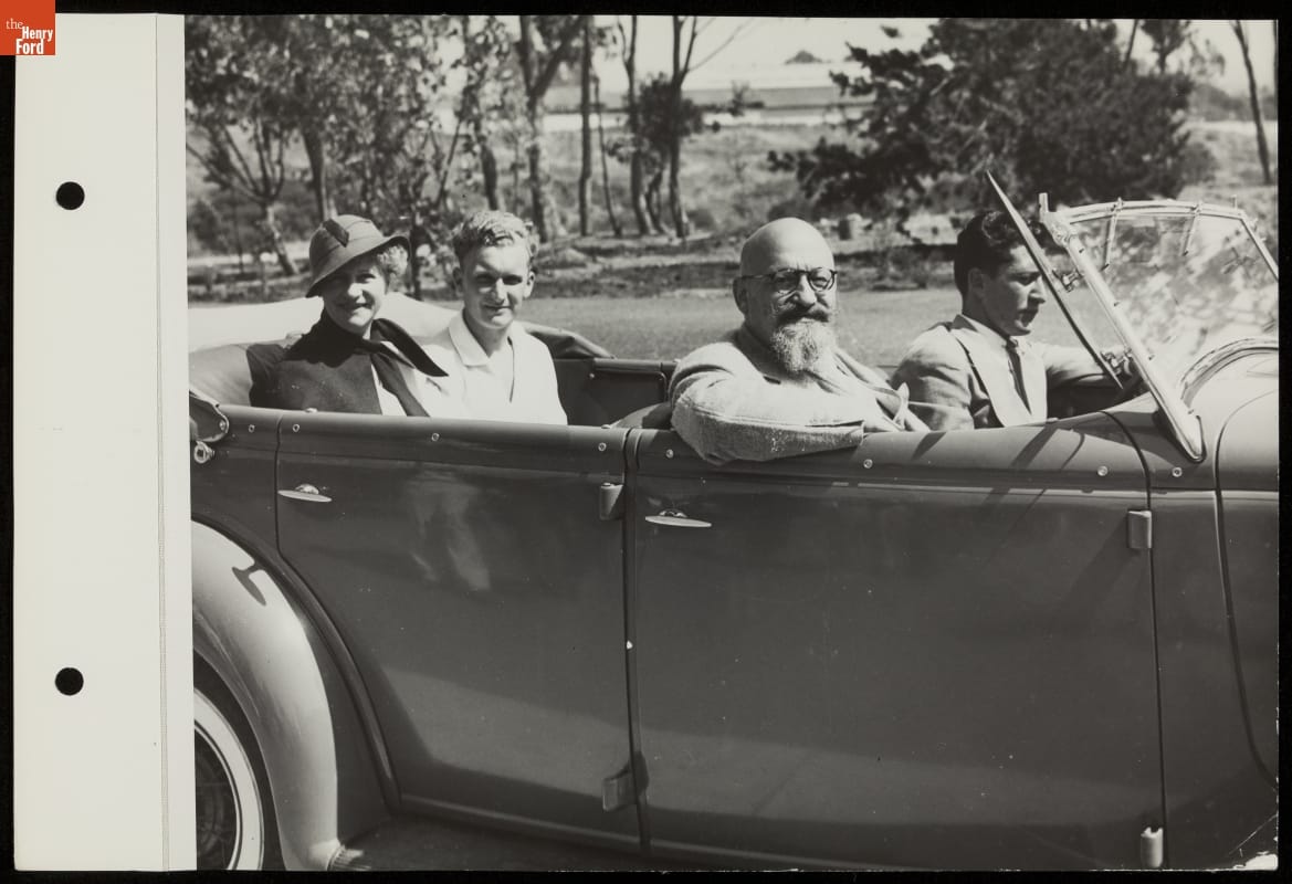 The Ford Exhibit at the 1935 California Pacific International Exposition featured "Roads of the Pacific," where visitors rode in brand new Ford V-8s over realistic reproductions of historic and modern roadways. In this photograph, Dr. Alfred Hertz (next to driver)--whose San Francisco Symphony Orchestra performed many concerts during the exposition--sets out for a tour of Ford's immersive experience.