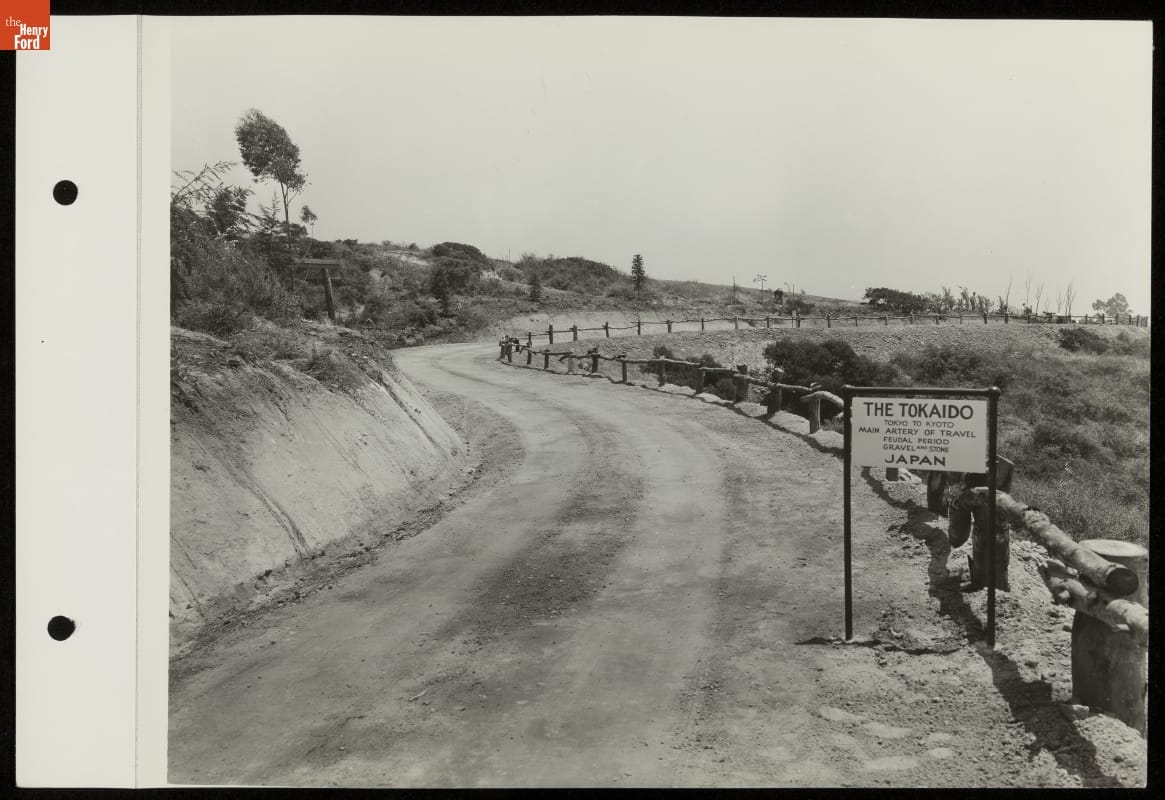 "Roads of the Pacific" was part of the Ford Exhibit, the most popular attraction at the 1935 California Pacific International Exposition. Visitors rode in brand new Ford V-8s over 14 reproductions of famous roads. This section representing the Tokaido, Japan's ancient East Sea Road, contributed to the immersive "Roads of the Pacific" experience.