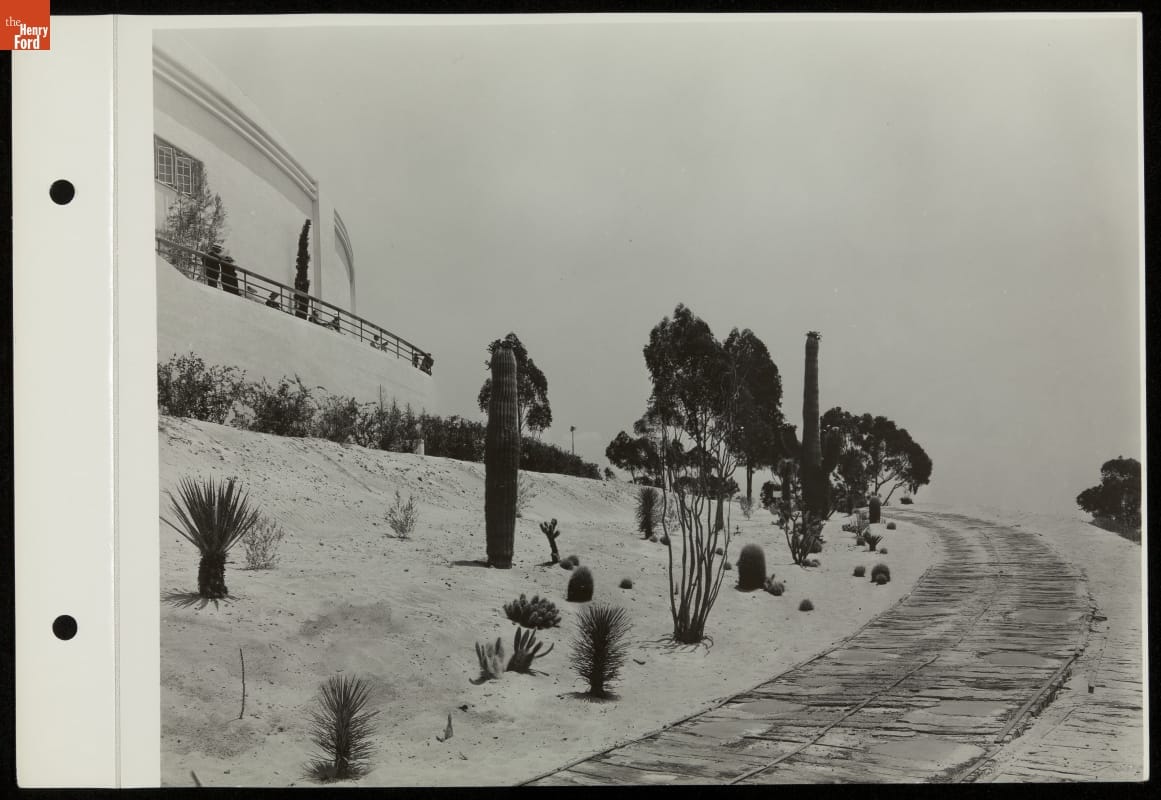 "Roads of the Pacific" was part of the Ford Exhibit, the most popular attraction at the 1935 California Pacific International Exposition. Visitors rode in brand new Ford V-8s over 14 reproductions of famous roads. This section representing a plank road that negotiated sand dunes between Yuma, Arizona, and San Diego, California, contributed to the immersive "Roads of the Pacific" experience.