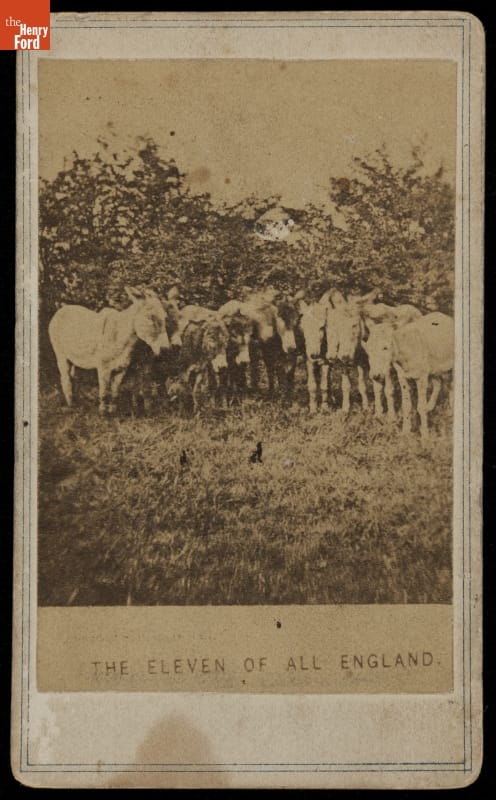 Cartes-de-visites were professionally made photographs that remained popular in the United States from the Civil War in the 1860s through the 1880s. This carte-de-visite from about 1865 mockingly depicts players of the famed first All-England cricket team, "the Eleven of All England," as donkeys. Americans commonly collected and exchanged the small cartes-de-visites to help them remember family, celebrities, places, or events.