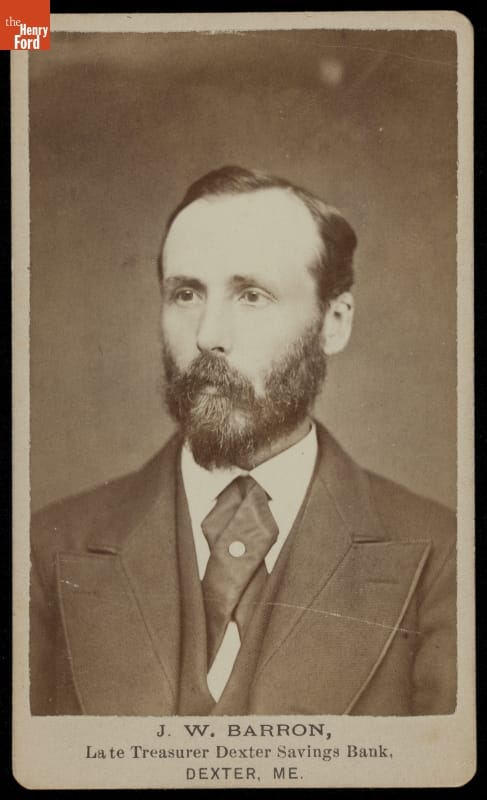 Cartes-de-visite -- small photographic prints on cardboard stock -- were made by professional photographers. This example from J. F. Page's Dexter, Maine, studio shows John W. Barron, treasurer of the Dexter Savings Bank, around 1870. Americans collected and exchanged cartes-de-visites, which remained popular in the United States from the Civil War in the 1860s through the 1880s.