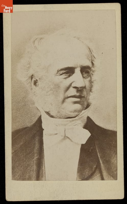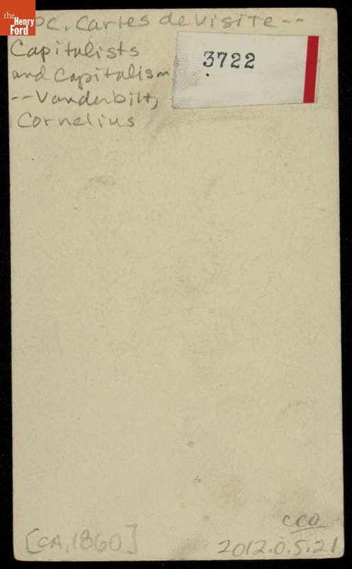 Cornelius Vanderbilt, a well-known American industrialist and philanthropist, posed for this carte-de-visite around 1860. The carte-de-visite was a small photographic print on cardboard stock made by professional photographers. People exchanged and collected portrait cartes-de-visite, popular in the United States from the Civil War in the 1860s through the 1880s, to help them remember family and celebrities.