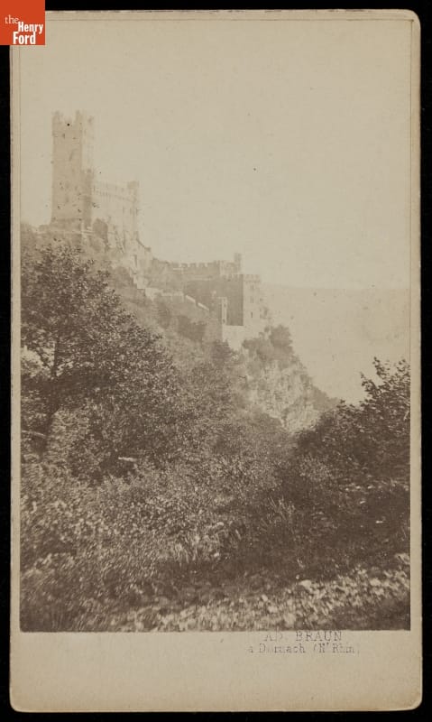 This French carte-de-visite shows a European castle around 1860. Cartes-de-visite - small photographic prints on cardboard stock - were made in professional photographers' studios. Americans collected and exchanged cartes-de-visites, which remained popular in the United States from the Civil War in the 1860s through the 1880s.