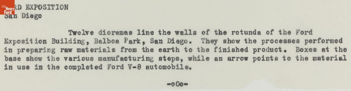 Through the 1930s, Ford Motor Company poured resources into exhibitions at regional and world's fairs. Henry Ford believed strongly in the educational value of such displays, and a corporate presence at the fairs benefitted public relations. Ford's popular exhibits and demonstrations -- pictured here in the 1935 California Pacific International Exposition Ford Building -- generated lots of publicity.
