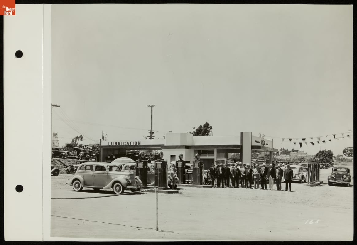 Ford Motor Company's corporate presence at the 1935 California Pacific International Exposition permeated the San Diego fairgrounds. In one parking lot, an enterprising local Ford dealer opened "Casey's Master Service Station." This modern exhibit was also a functioning station, servicing automobiles while their owners explored the fair. Casey's and other Exposition attractions heightened Ford's visibility and provided bonus advertising.