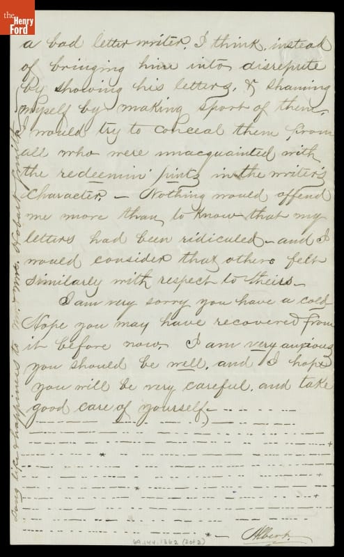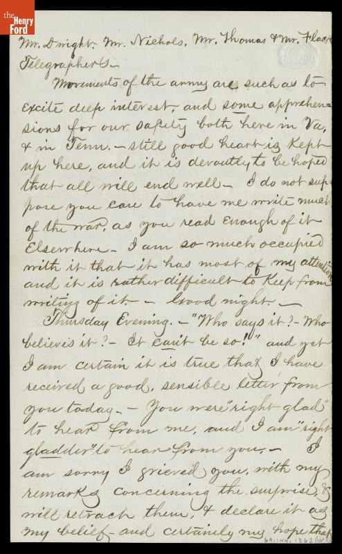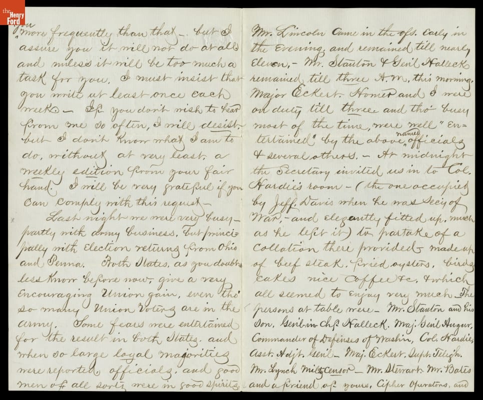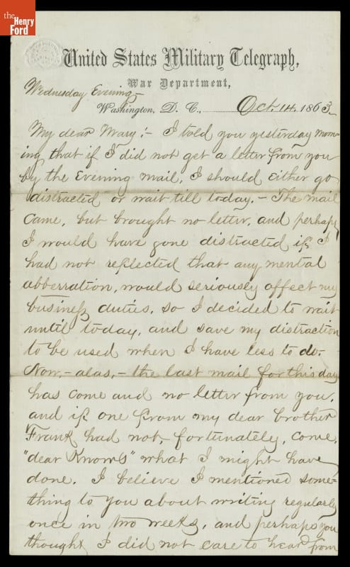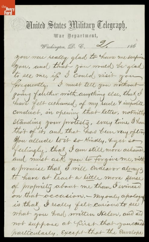 Albert B. Chandler served as a cipher operator at the War Department office in Washington, D.C., during the Civil War. He transmitted coded messages to and decoded messages from Union military field commanders. While at this post, he became acquainted with President Abraham Lincoln. Chandler describes some of his wartime experiences in this letter to Marilla Stedman, his future bride.