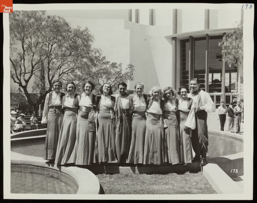 Jose Manzaneres and His South American Orchestra Pose at the V-8 Fountain, Central Courtyard of Ford Building, California Pacific International Exposition, 1935