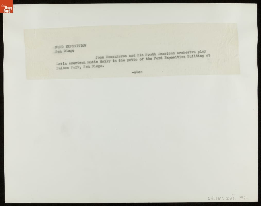 Ford Motor Company poured resources into the 1935 California Pacific International Exposition in San Diego, constructing the fair's largest and most popular exhibition. Ford's massive steel and concrete Exposition building included an open-air courtyard and patio where visitors could relax and listen to rumba and dance rhythms performed by Jose Manzaneres's South American musical group.