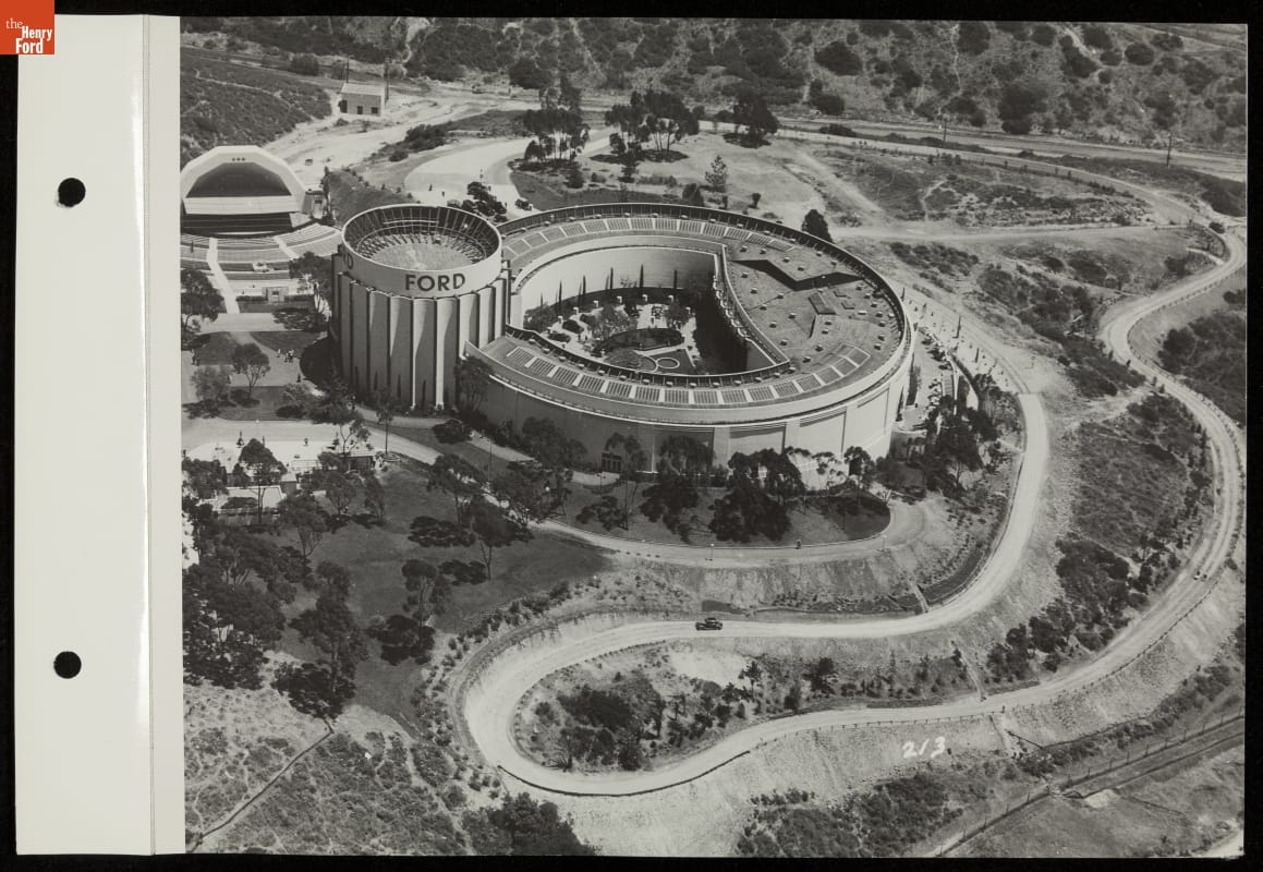 "Roads of the Pacific" was part of the Ford Exhibit, the most popular attraction at the 1935 California Pacific International Exposition. Visitors to the experience rode in brand new Ford V-8s over 14 reproductions of historic and modern roadways. This aerial photograph shows the Ford Building and Ford Bowl amphitheater surrounded by the meandering "Roads of the Pacific."