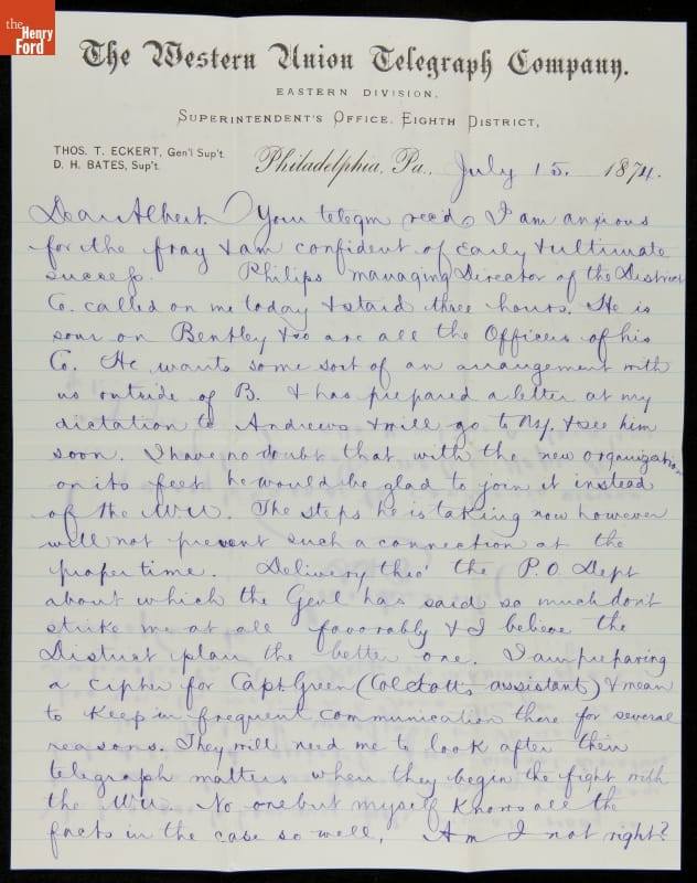 Letter from David H. Bates to Albert B. Chandler, 1874