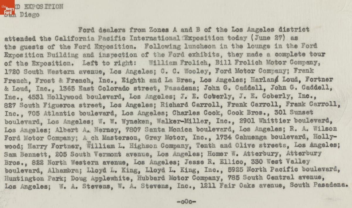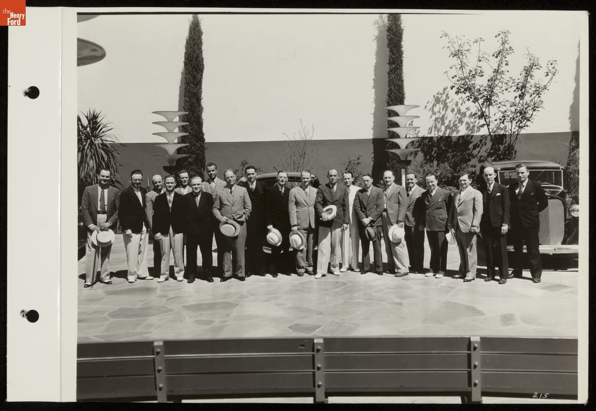Ford Motor Company poured resources into the 1935 California Pacific International Exposition in San Diego, constructing the fair's largest and most popular exhibition. Ford's massive steel and concrete building enclosed an open-air courtyard featuring a V-8 emblem-shaped fountain. This group of Los Angeles, California, area Ford dealers posed in the space, where guests could rest and enjoy daily musical performances.