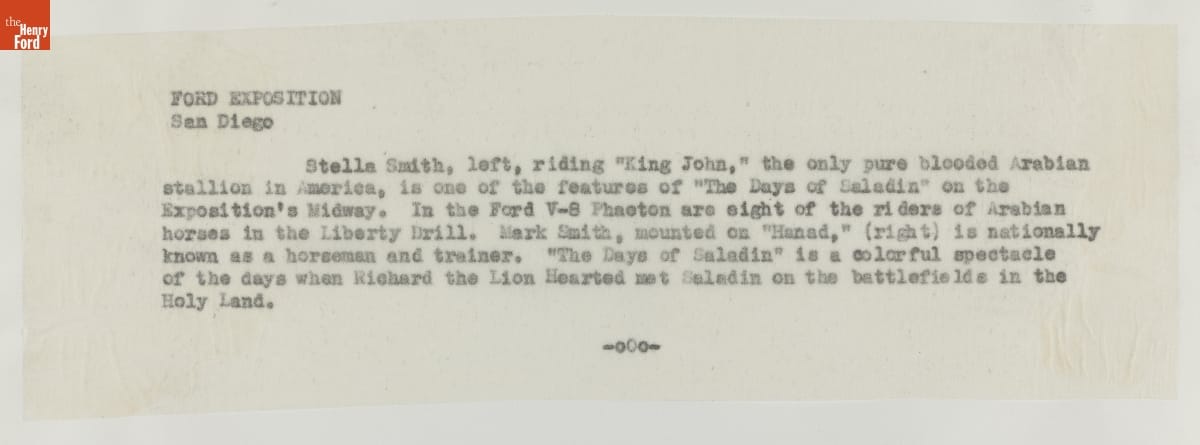 In 1913, Henry Ford established Ford Motor Company's photographic department. Though few internal records describe company photography, remaining photographs reveal a wide range of departmental activity. Among many other events, Ford photographers documented the 1935 California Pacific International Exposition in San Diego -- where Ford Motor Company's exhibition was the largest and most popular.