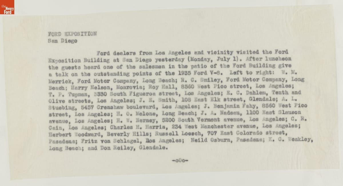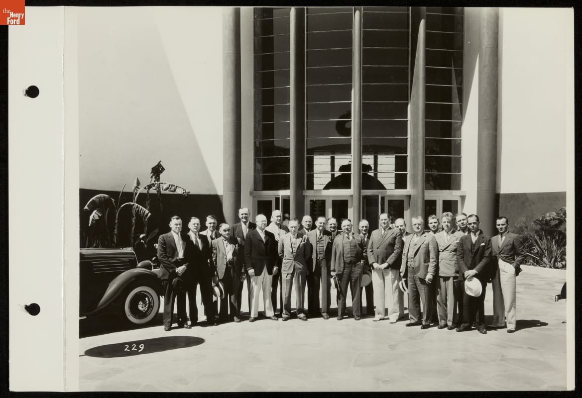 Ford Motor Company poured resources into the 1935 California Pacific International Exposition in San Diego, constructing the fair's largest and most popular exhibition. Ford's massive steel and concrete building enclosed an open-air courtyard featuring a V-8 emblem-shaped fountain. This group of Los Angeles, California, area Ford dealers posed in the space, where guests could rest and enjoy daily musical performances.