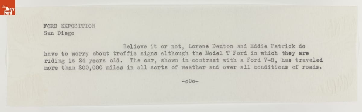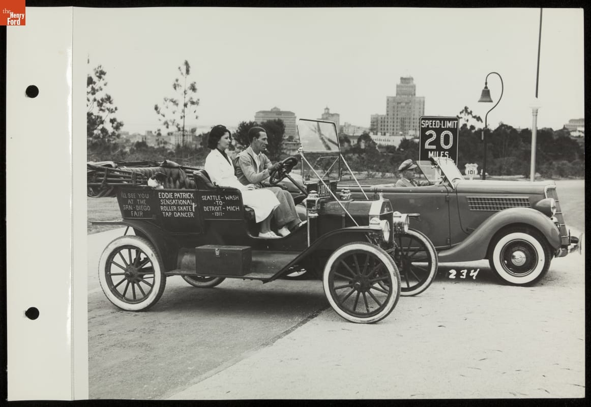 Entertainer Eddie Patrick raced his 1911 Model T against a brand new V-8 over Ford's "Roads of the Pacific" experience at the 1935 California Pacific International Exposition. This stunt was just one of the multitude of exhibits, demonstrations, and performances that drew fairgoers to the Ford Exhibit -- the Exposition's largest and most popular attraction.