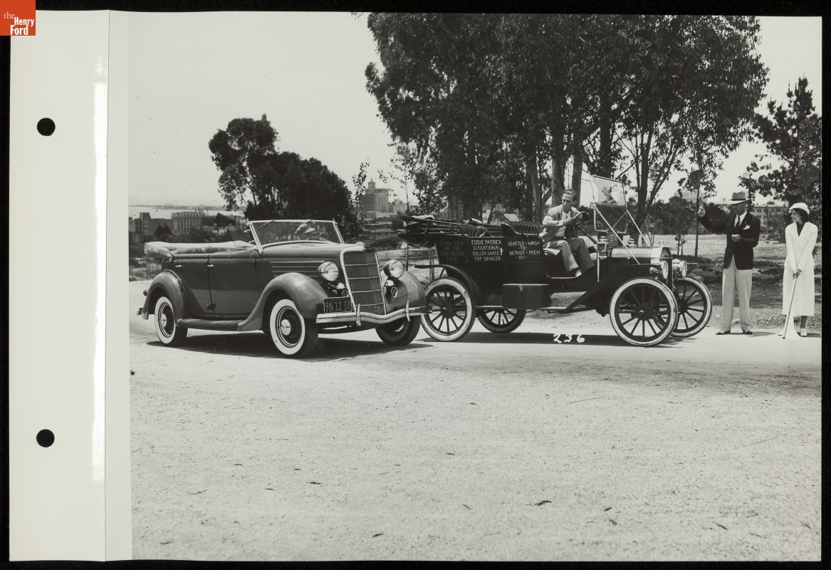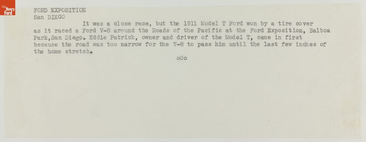 Entertainer Eddie Patrick raced his 1911 Model T against a brand new V-8 over Ford's "Roads of the Pacific" experience at the 1935 California Pacific International Exposition. This stunt was just one of the multitude of exhibits, demonstrations, and performances that drew fairgoers to the Ford Exhibit -- the Exposition's largest and most popular attraction.