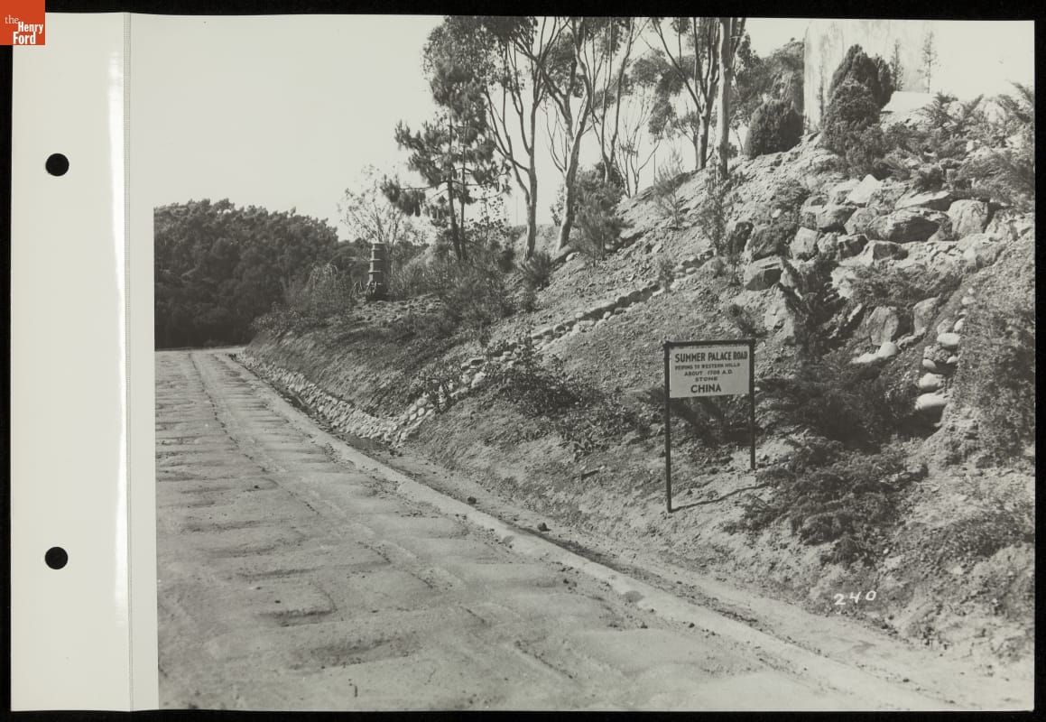 "Roads of the Pacific" was part of the Ford Exhibit, the most popular attraction at the 1935 California Pacific International Exposition. Visitors rode in brand new Ford V-8s over 14 reproductions of famous roads. This section representing China's ancient Summer Palace Road contributed to the immersive "Roads of the Pacific" experience.