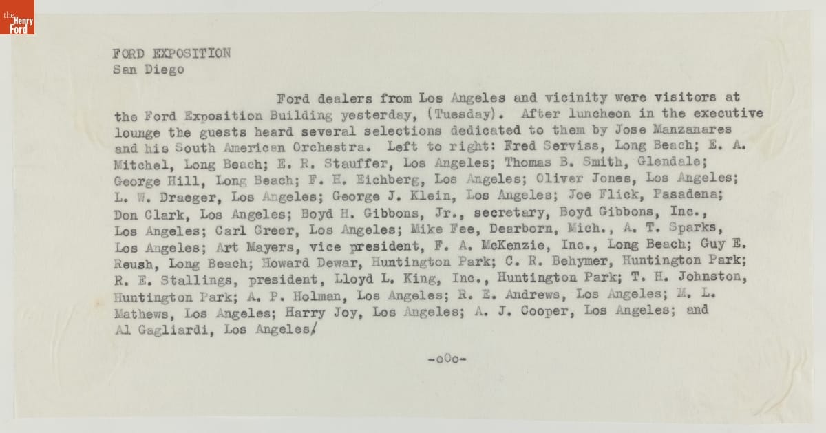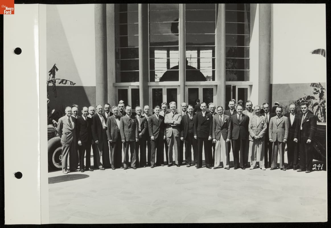 Ford Motor Company poured resources into the 1935 California Pacific International Exposition in San Diego, constructing the fair's largest and most popular exhibition. Ford's massive steel and concrete building enclosed an open-air courtyard featuring a V-8 emblem-shaped fountain. This group of Los Angeles, California, area Ford dealers posed in the space, where guests could rest and enjoy daily musical performances.