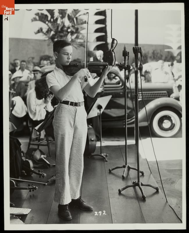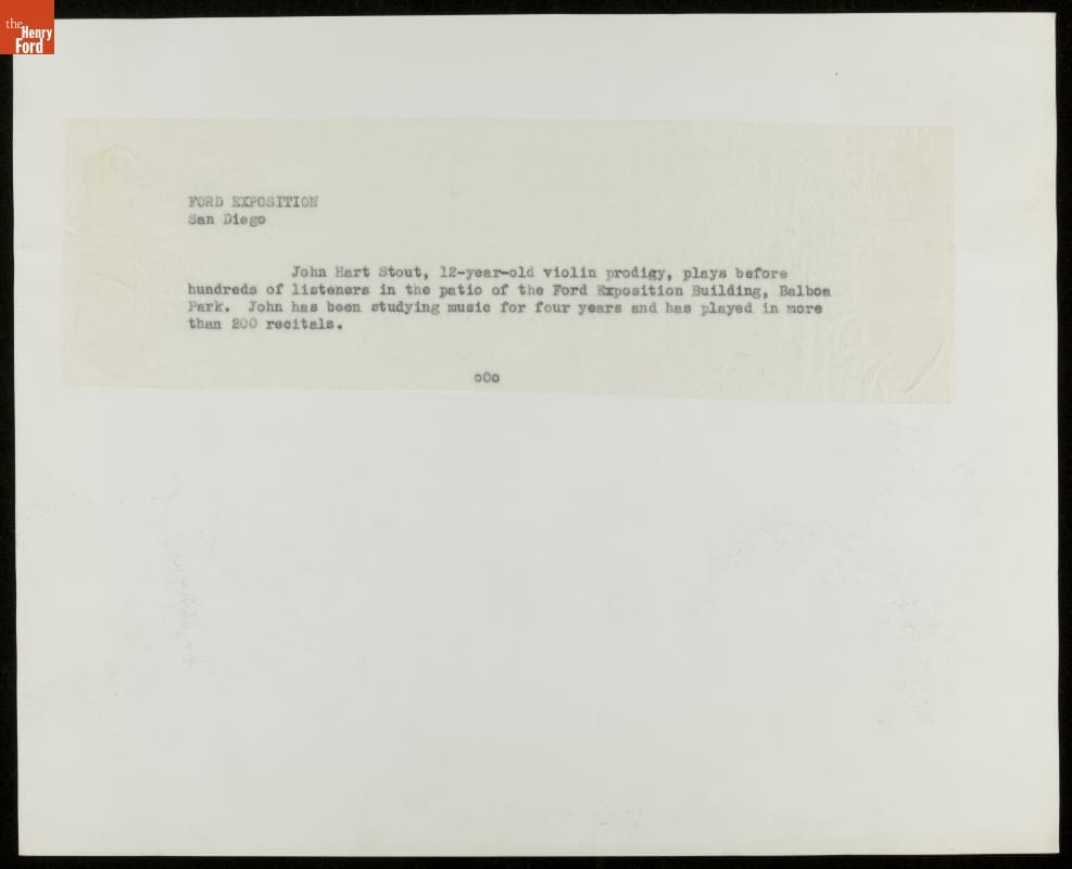 Ford Motor Company poured resources into the 1935 California Pacific International Exposition in San Diego, constructing the fair's largest and most popular exhibition. Ford's massive steel and concrete Exposition building included an open-air courtyard and patio where visitors could relax and listen to daily musical performances.
