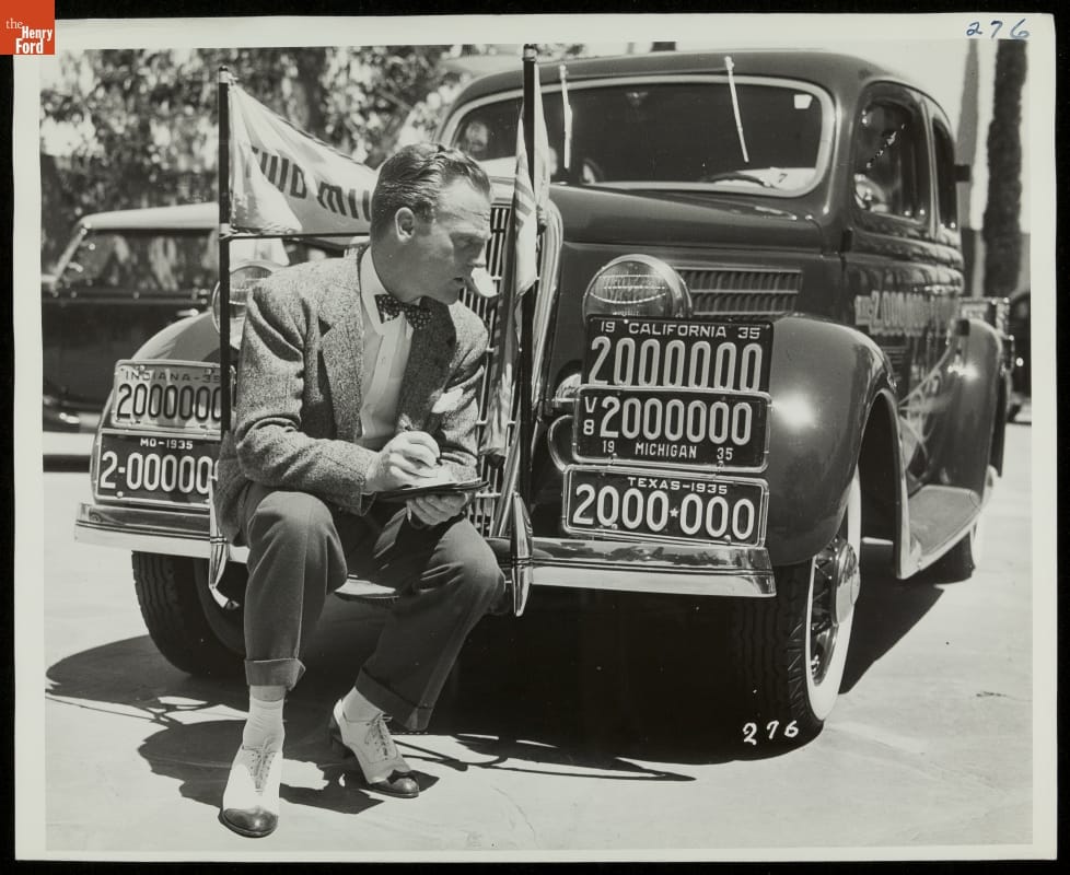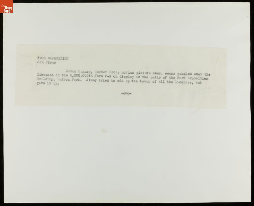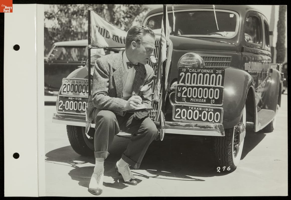 In June 1935, the two-millionth Ford V-8 automobile rolled off the Rouge Plant assembly line. Driven by Jimmy Rooney, a goodwill ambassador for Ford, the sedan embarked on a public relations tour from Dearborn, Michigan, to San Diego, California. Visitors, including some famous actors, welcomed the famous V-8 with fanfare when it finally arrived at the California Pacific International Exposition.