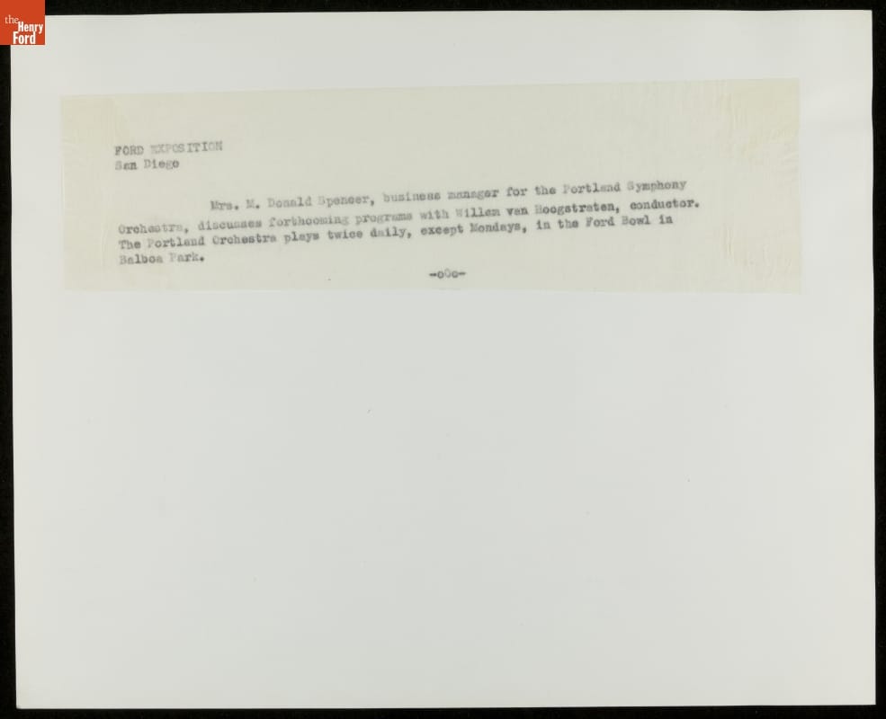Ford Motor Company poured resources into the 1935 California Pacific International Exposition in San Diego, constructing the fair's largest and most popular exhibition. Performers in the 3,000-seat Ford Music Bowl amphitheatre included the Portland Symphony Orchestra. Music Bowl concerts - free to visitors and broadcast nationally by radio - broadened Ford's corporate presence at the Exposition and provided bonus advertising.