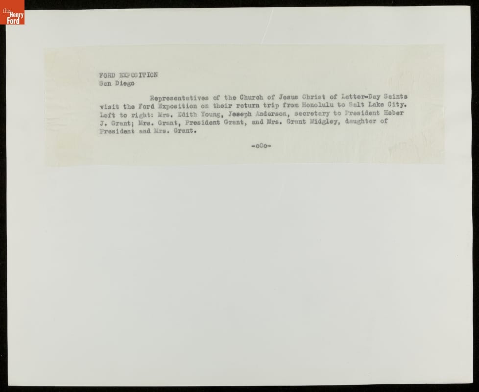 Ford Motor Company was the major exhibitor at the 1935 California Pacific International Exposition in San Diego. The Ford Building, Music Bowl, and outdoor "Roads of the Pacific" experience composed the Exposition's largest and most popular attraction. Among the Ford Exhibit's 2.5 million visitors was Heber J. Grant, then president of the Church of Jesus Christ of Latter-day Saints.