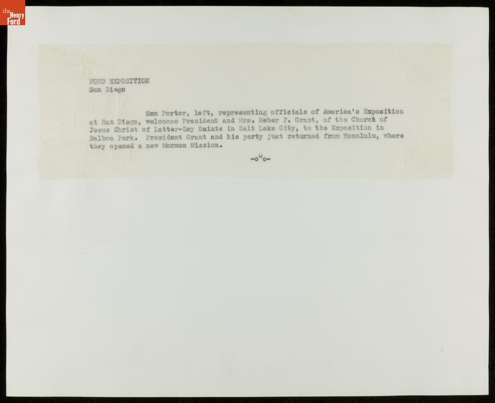 Ford Motor Company was the major exhibitor at the 1935 California Pacific International Exposition in San Diego. The Ford Building, Music Bowl, and outdoor "Roads of the Pacific" experience composed the Exposition's largest and most popular attraction. Among the Ford Exhibit's 2.5 million visitors was Heber J. Grant, then president of the Church of Jesus Christ of Latter-day Saints.