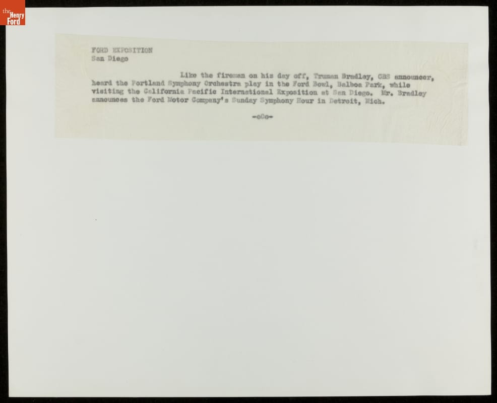 Ford Motor Company poured resources into the 1935 California Pacific International Exposition in San Diego, constructing the fair's largest and most popular exhibition. A 3,000-seat outdoor amphitheater next to the Ford Building offered free musical performances. These Ford Music Bowl concerts, broadcast nationally by the Columbia Broadcasting System, broadened Ford's corporate presence at the Exposition and provided bonus advertising.
