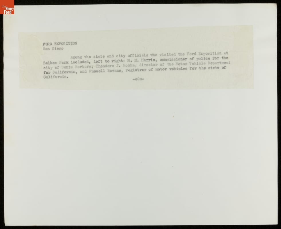 Ford Motor Company was the major exhibitor at the 1935 California Pacific International Exposition in San Diego. The Ford Building, Music Bowl, and outdoor "Roads of the Pacific" experience composed the Exposition's largest and most popular attraction. Ford hosted these three California government officials, who numbered among the reported 2.5 million fairgoers to visit the Ford Exhibit.