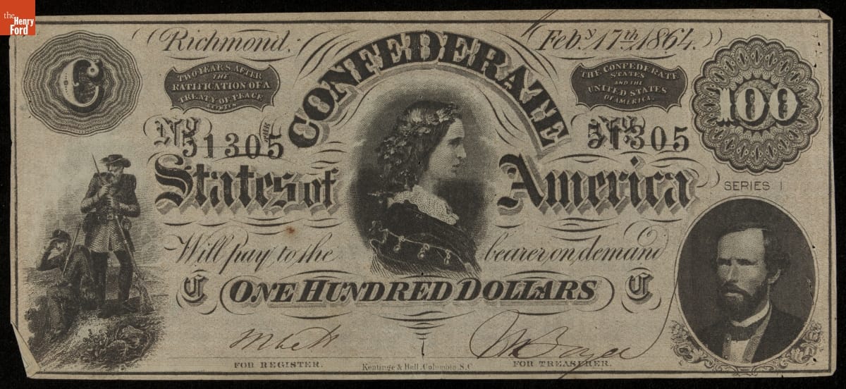 In part recto: RICHMOND / FEB 17 1864 / TWO YEARS AFTER/ THE / RATIFICATION OF A / TREATY OF PEACE / BETWEEN / THE CONFEDERATE / STATES AND THE / UNITED STATES / OF AMERICA / THE CONFEDERATE / STATES OF AMERICA / WILL PAY TO THE BEARER ON DEMAND / ONE HUNDRED DOLLARS / No. 51305 / Keatinge & Ball Columbia S.C. / SERIES I