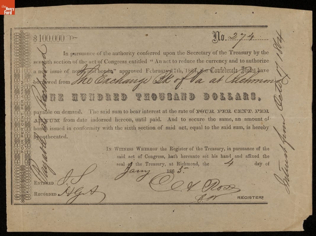 In part recto: $100,000 / No. 274 / .../ February 17th, 1864, the Confederate States have borrowed from [handwritten] The Exchange BK (?) of Va (?) at Richmond / interest from Octo 17 1864