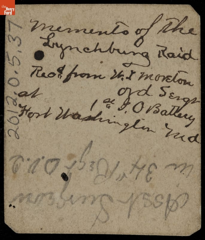 Memento (sic) of the / Lynchburg Raid / Rec'd from W. I. Moreton / Ord Sergt / at 1st I.O. Battery / Fort Washington, MD