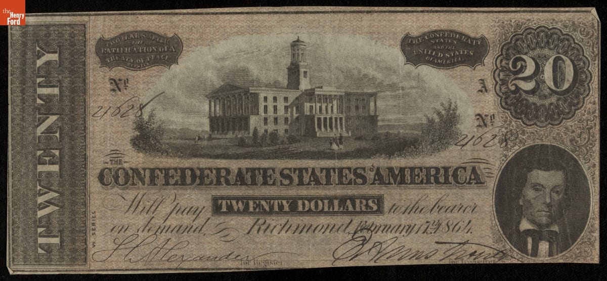 Recto, in part: THE CONFEDERATE STATES OF AMERICA / WILL PAY TWENTY DOLLARS TO THE BEARER / ON DEMAND / RICHMOND FEBRUARY 17TH 1864 / KEATINGE & BALL COLUMBIA S.C. / 20 / SERIES VI / NO. 4028