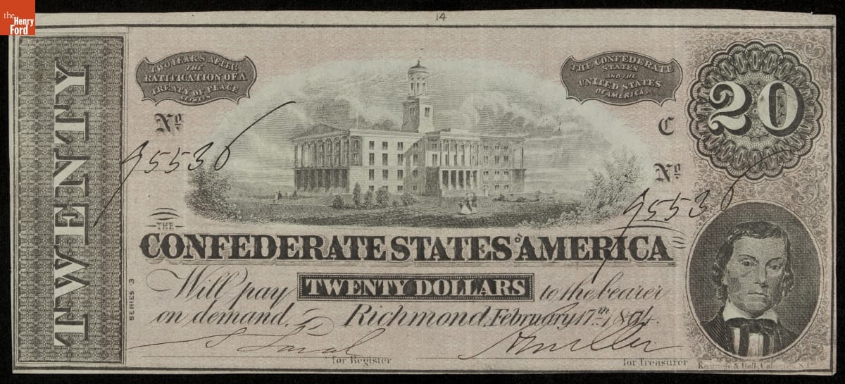 Recto, in part: THE CONFEDERATE STATES OF AMERICA / WILL PAY TWENTY DOLLARS TO THE BEARER / ON DEMAND / RICHMOND FEBRUARY 17TH 1864 / KEATINGE & BALL COLUMBIA S.C. / 20 / SERIES 3 / NO. 95530
