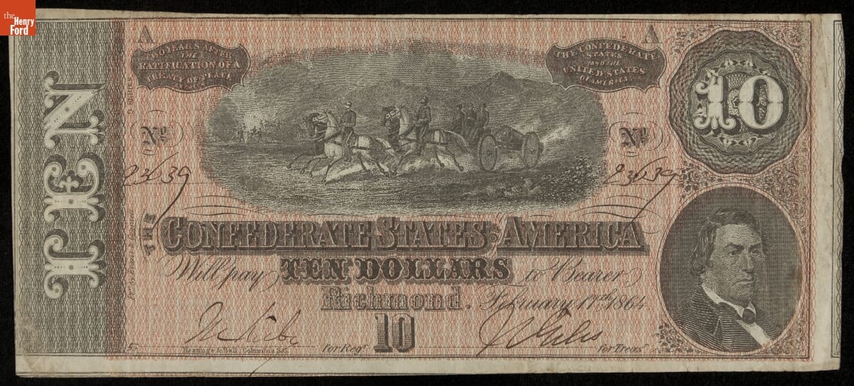 Recto, in part: THE CONFEDERATE STATES OF AMERICA / WILL PAY TEN DOLLARS TO BEARER / RICHMOND FEBRUARY 17TH 1864 / ENGRAVED BY KEATINGE & BALL COLUMBIA S.C. / LITHO'D BY EVANS & COGSWELL / NO. 23639 / 9 SERIES