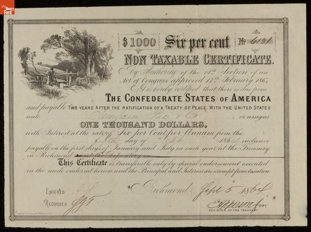 Recto, in part: $1000 SIX PERCENT / NO. 6131 / NON TAXABLE CERTIFICATE / [...] / THE CONFEDERATE STATES OF AMERICA / [...] / SAMPSON PAE & CO. / ONE THOUSAND DOLLARS / [...] / FIFTH DAY OF SEPTEMBER 1864 / [...] RICHMOND / ENGD BY GEO DUNN & CO RICHMOND VA. /