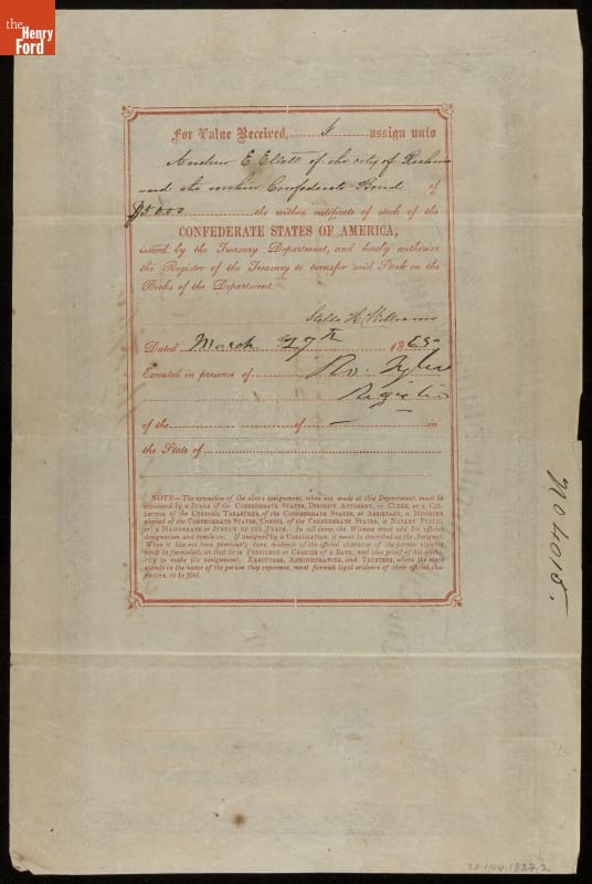 Stella Williams was a wealthy orphan in 1860, living with her aunt and uncle in Richmond, Virginia. In January 1862, 19-year-old Stella purchased this $5,000 bond -- equal to one-fourth of her wealth. At 8% interest, it seemed like a good investment. Initially, at least, it was. Once the war was lost, Southerners like Stella were left holding now worthless Confederate bonds.