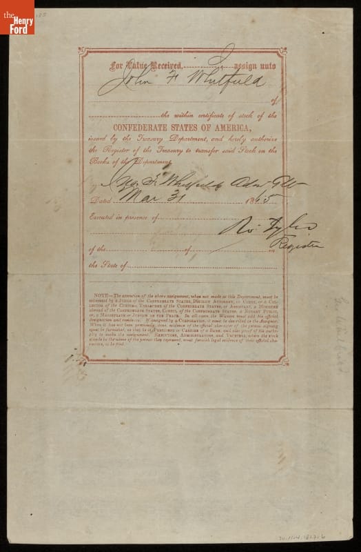 To help raise money, the Confederate States of America issued bonds. Early in the Civil War, these bonds seemed a worthwhile, even patriotic, investment to the Southerners who bought them. The war was going well for the Confederacy and the bonds promised a tidy profit in interest. At war's end, Southerners were left holding now worthless Confederate bonds.
