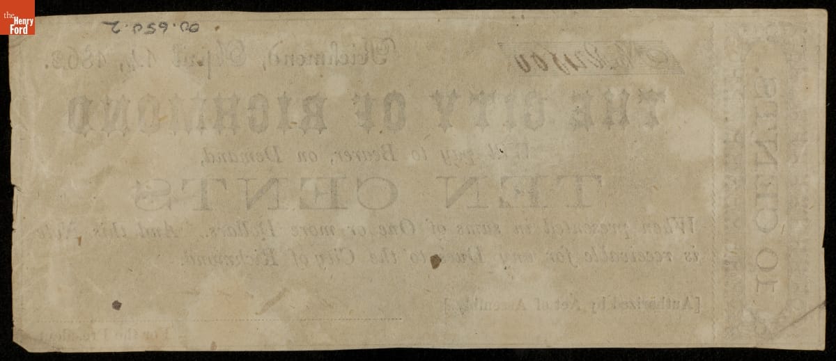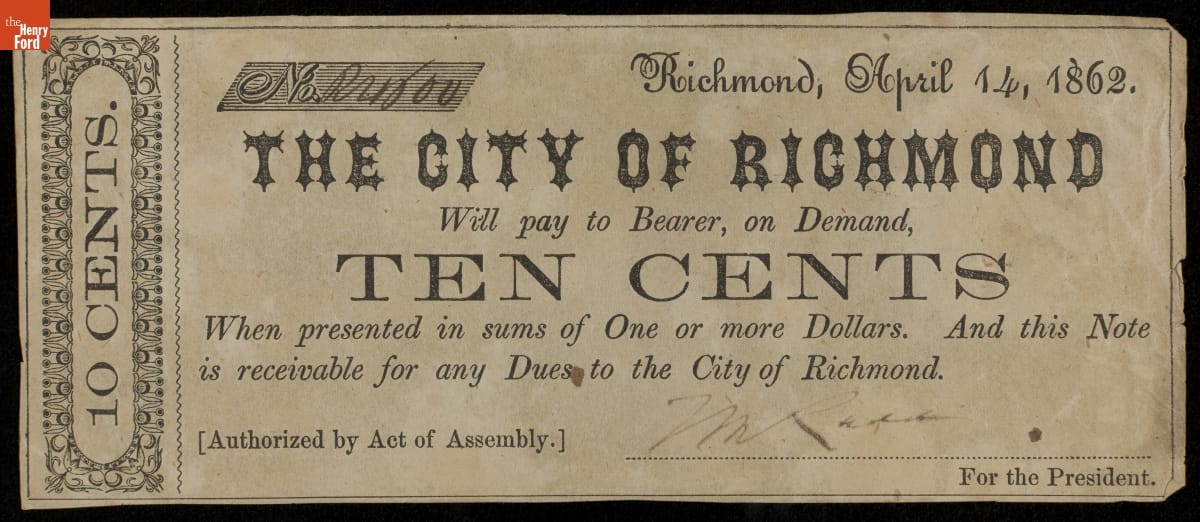 Recto, in part: 10 CENTS / NO. [illeg] / RICHMOND, APRIL 14, 1862 / THE CITY OF RICHMOND / WILL PAY TO BEARER, ON DEMAND / TEN CENTS / ...