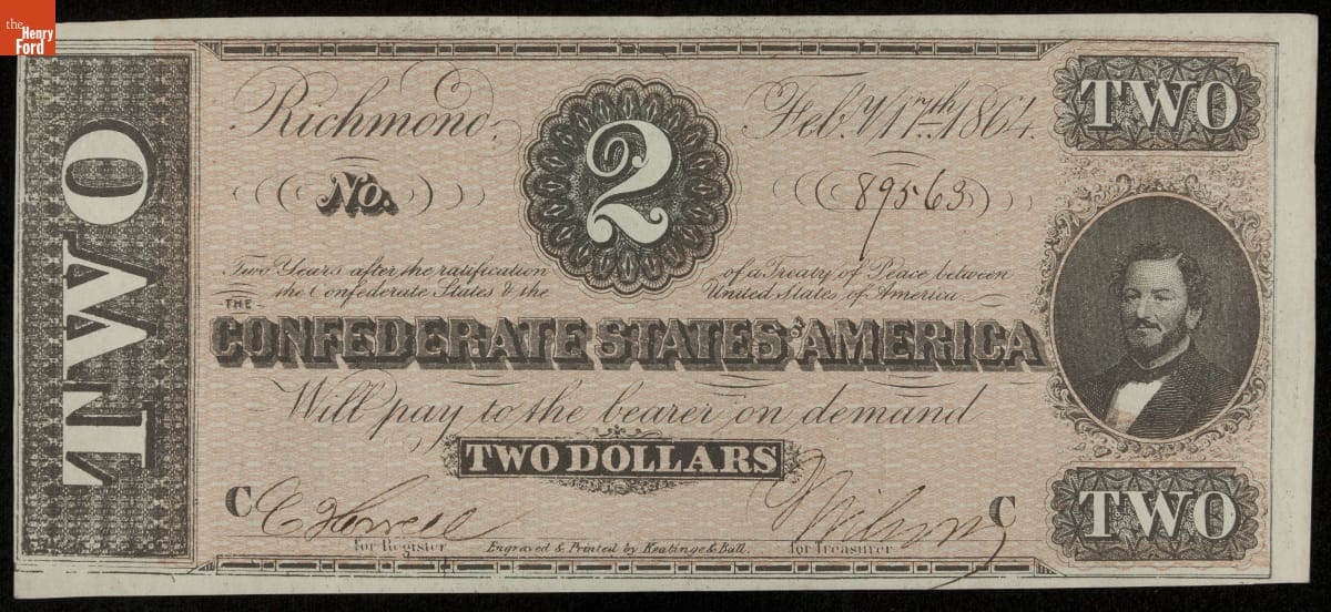 In part, recto: RICHMOND FEB 17TH 1864 / THE CONFEDERATE STATES OF AMERICA / WILL PAY TO THE BEARER ON DEMAND / TWO DOLLARS / / NO.89563 / KEATINGE & BALL COLUMBIA S.C./