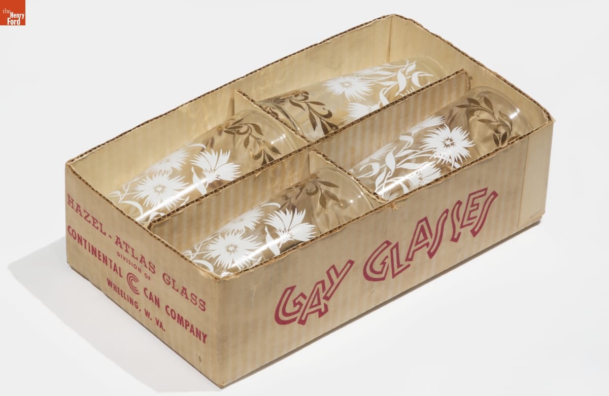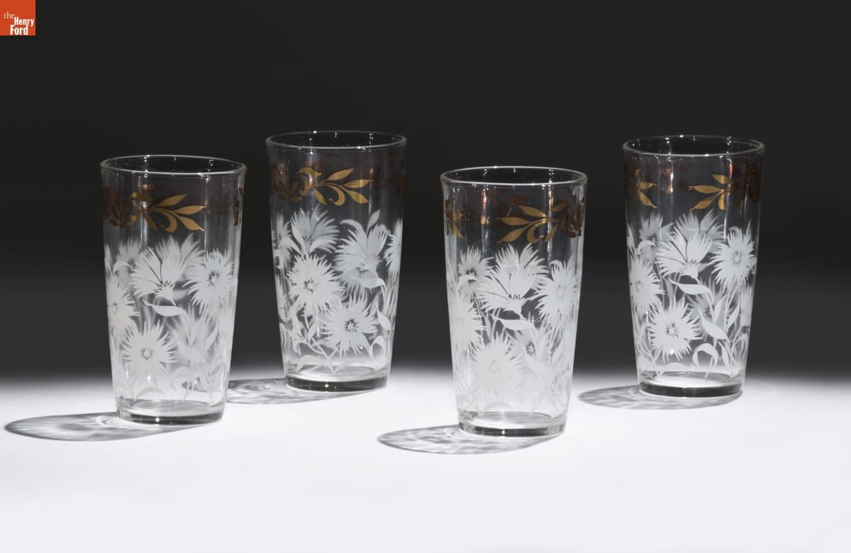 From the late 1930s through the 1960s, glass manufacturers designed "hostess sets" for every taste and budget. Often presented as wedding or housewarming gifts, these sets became features of the popular cocktail and patio parties of the time. The decoration on the glassware, such as the white flowers and gold foliage depicted on these tumblers, reflected the personality of the hostess.