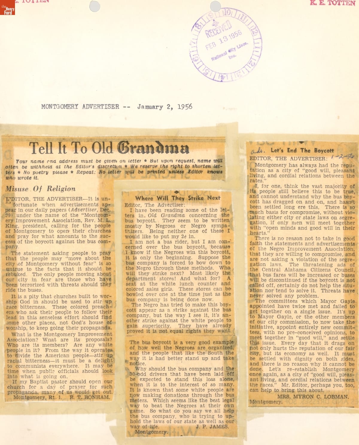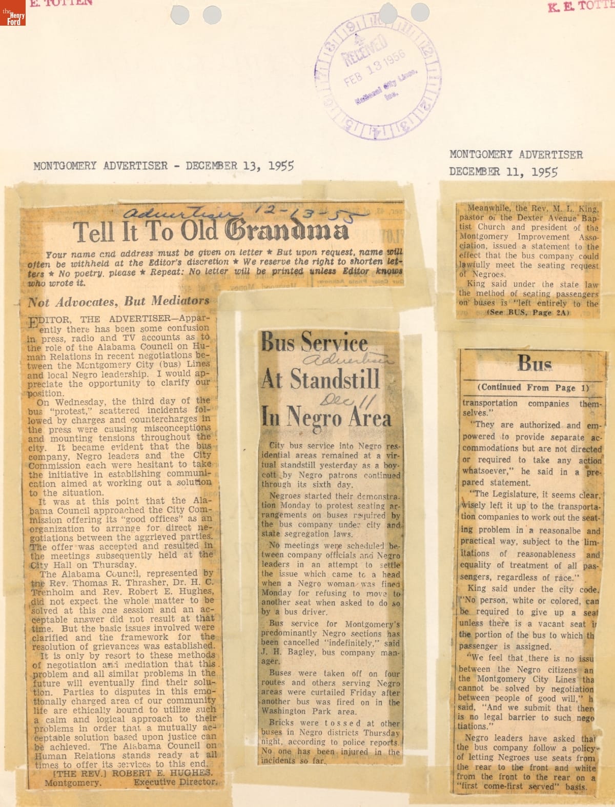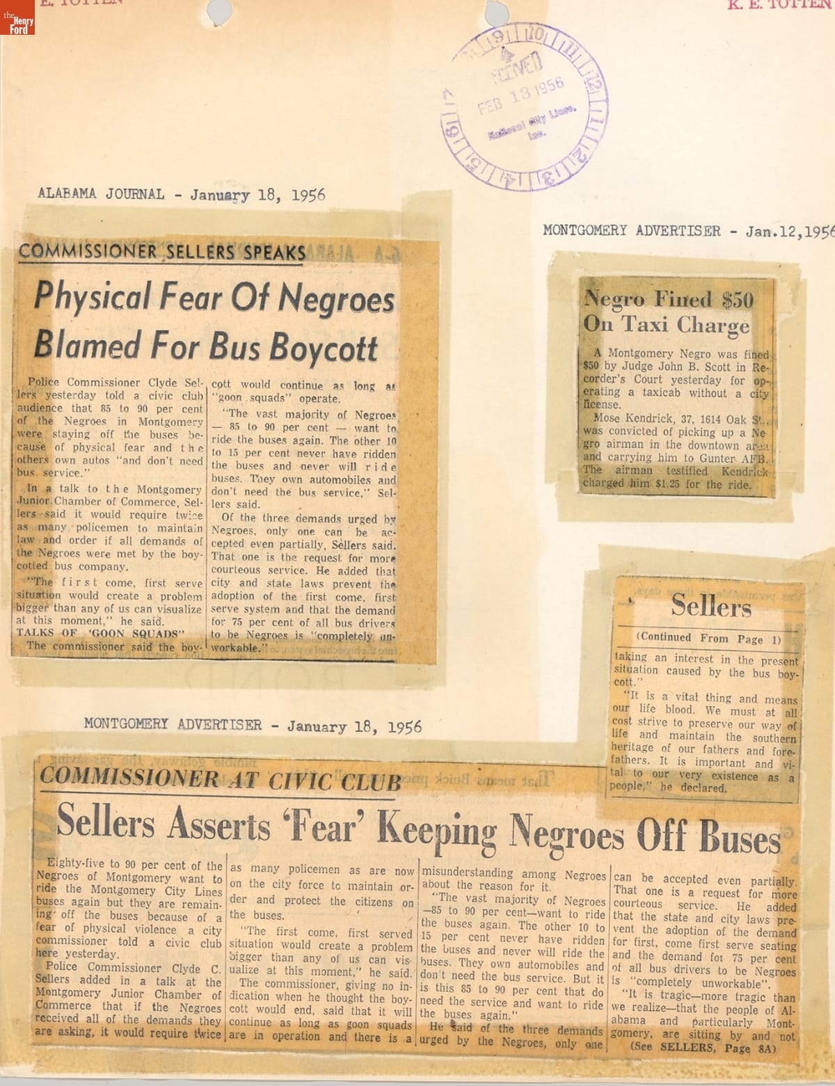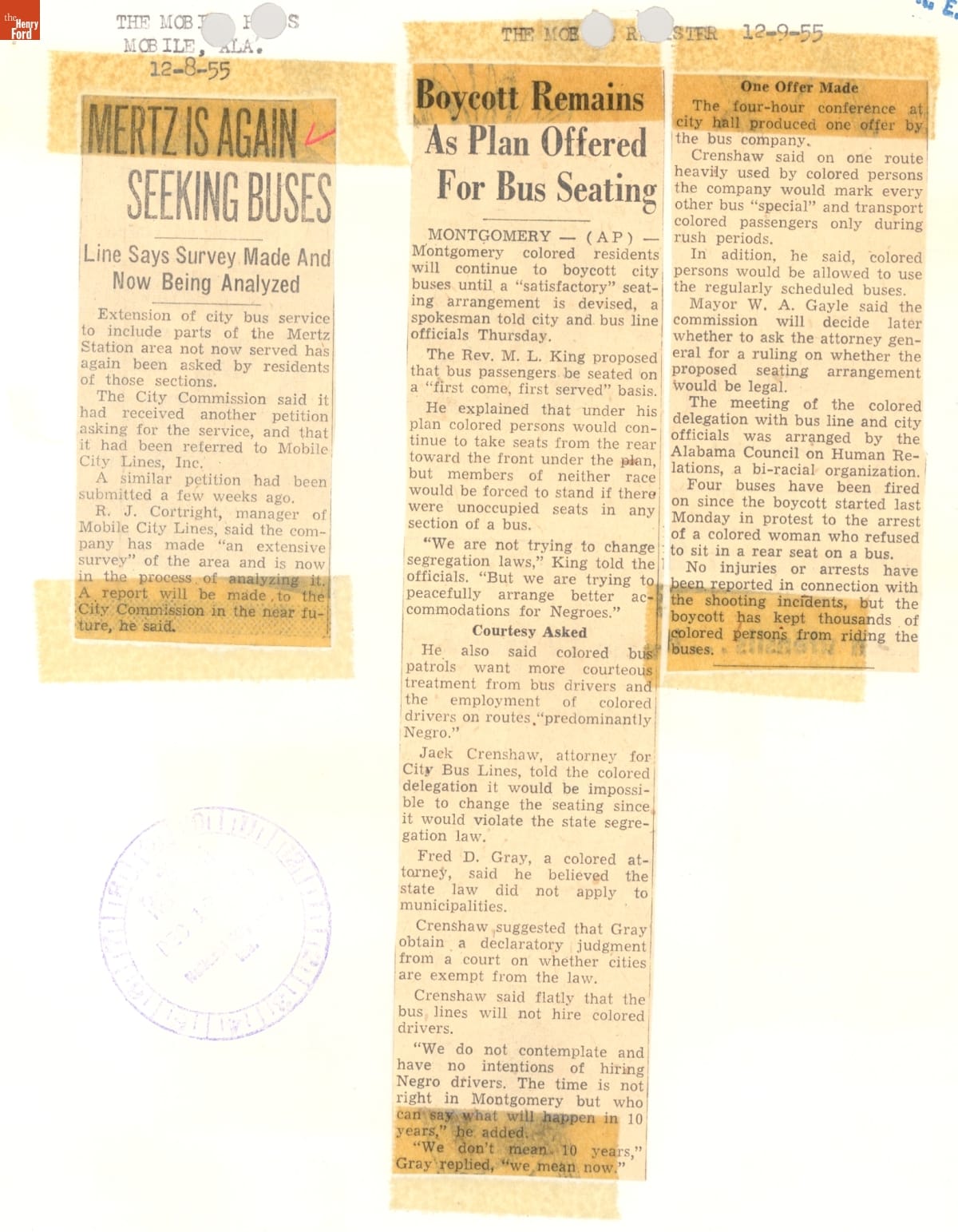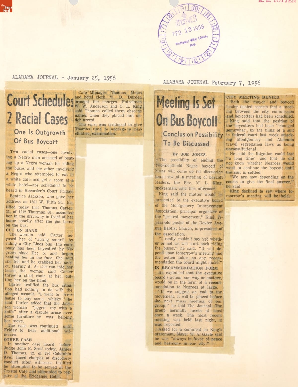 These newspaper articles come from a scrapbook of newspaper clippings saved by Charles "Homer" Cummings, a Montgomery City bus lines manager. Together, these articles recount the story of the 381-day Montgomery bus boycott that was inspired by the arrest of Rosa Parks, who refused to give up her bus seat to a white man despite existing segregation laws.
