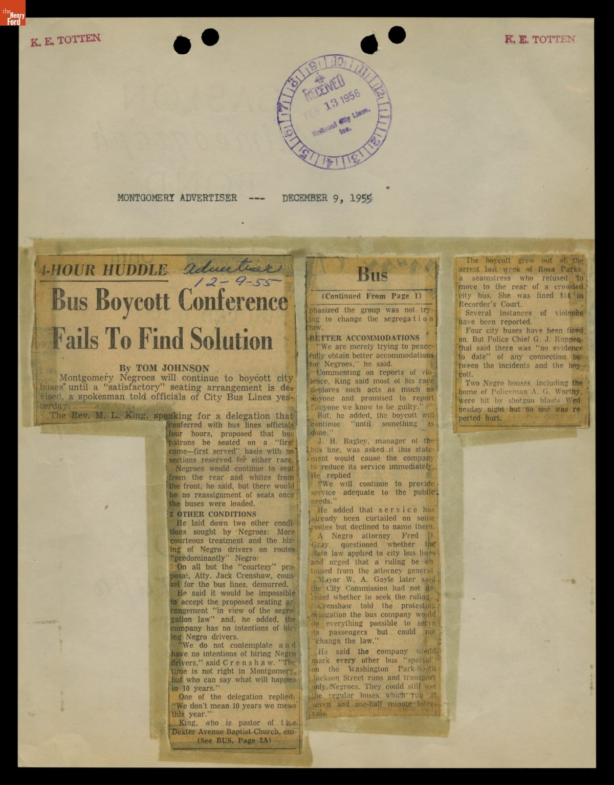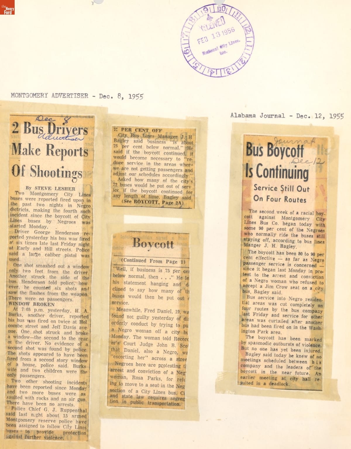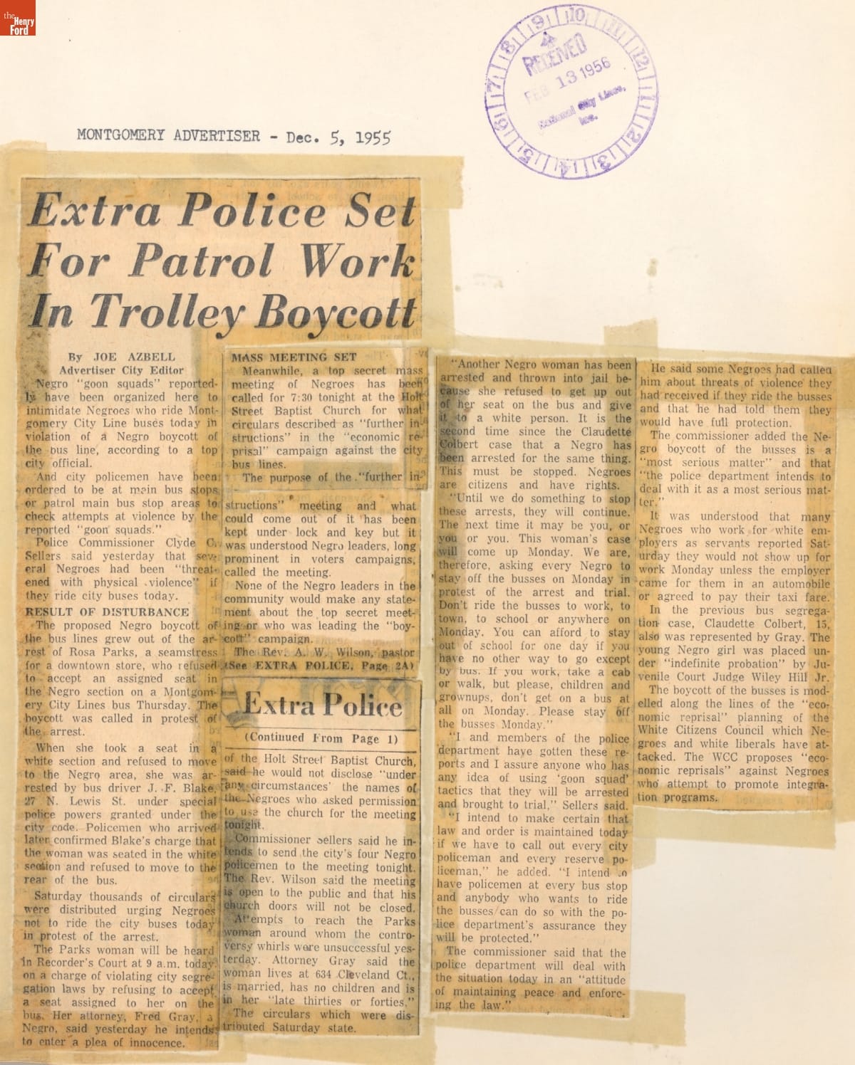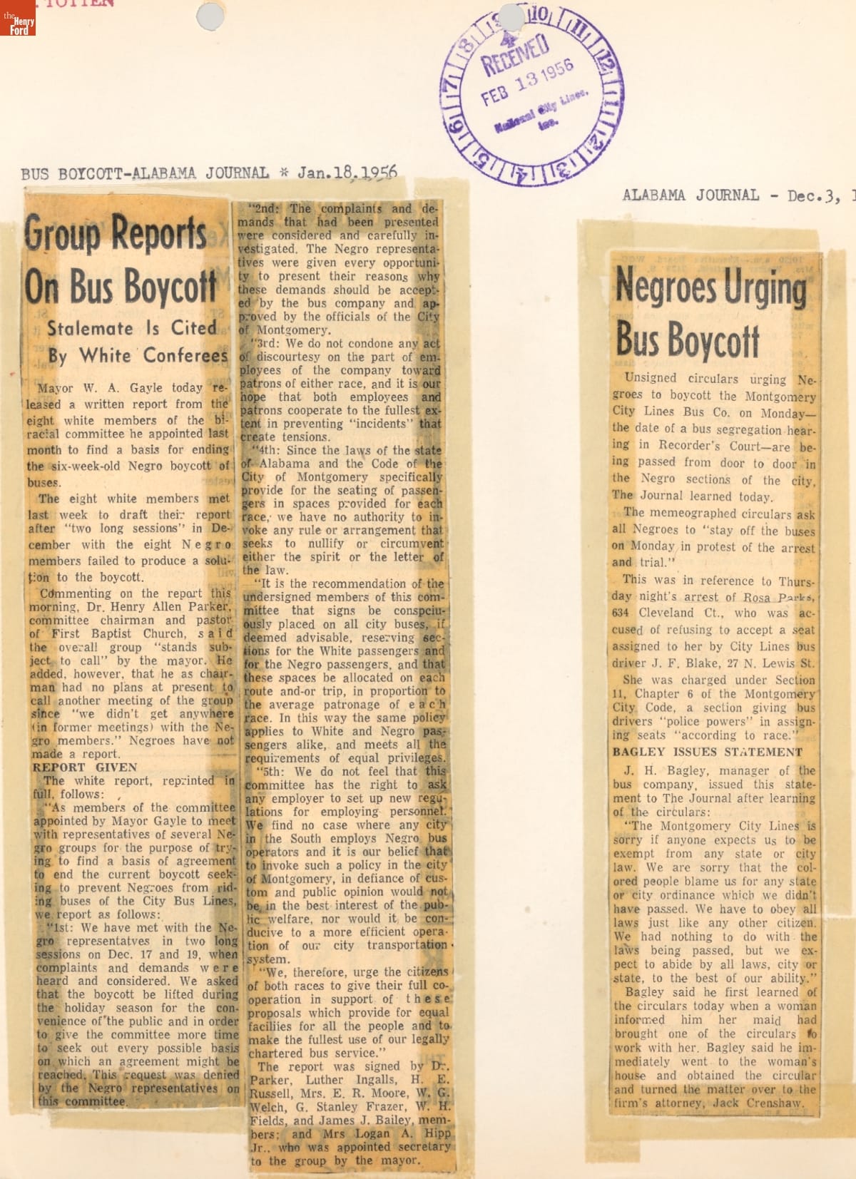 These newspaper articles come from a scrapbook of newspaper clippings saved by Charles "Homer" Cummings, a Montgomery City bus lines manager. Together, these articles recount the story of the 381-day Montgomery bus boycott that was inspired by the arrest of Rosa Parks, who refused to give up her bus seat to a white man despite existing segregation laws.