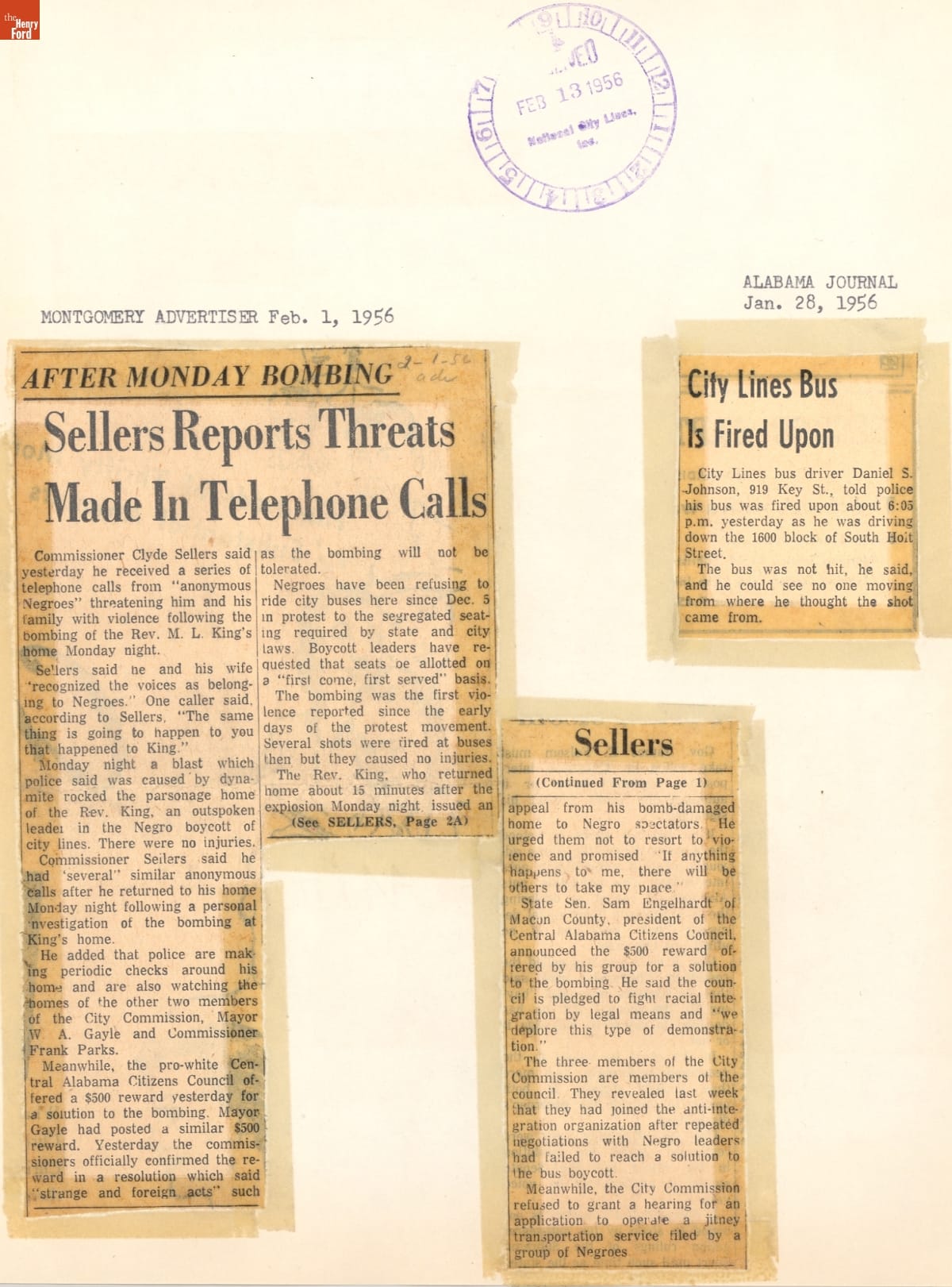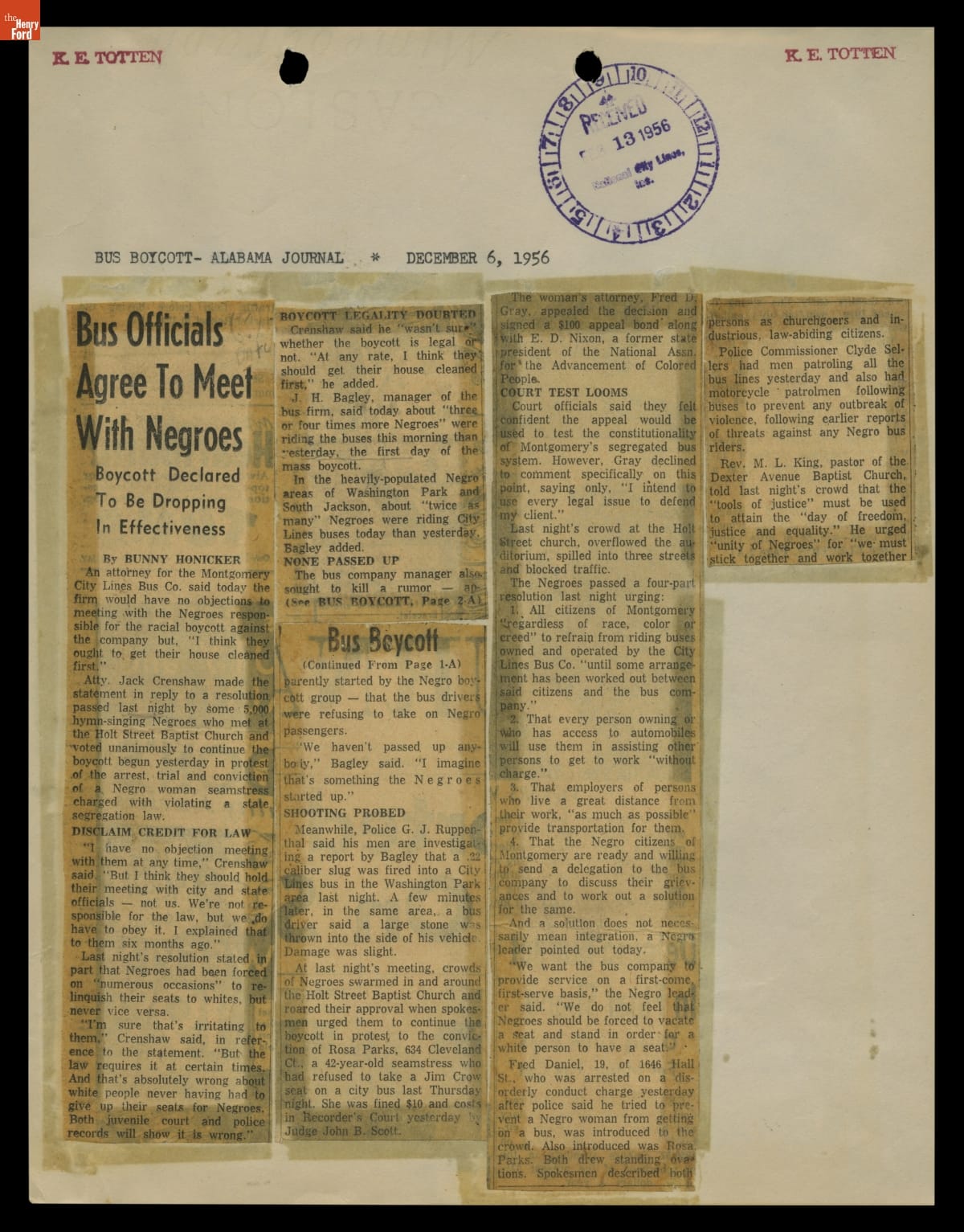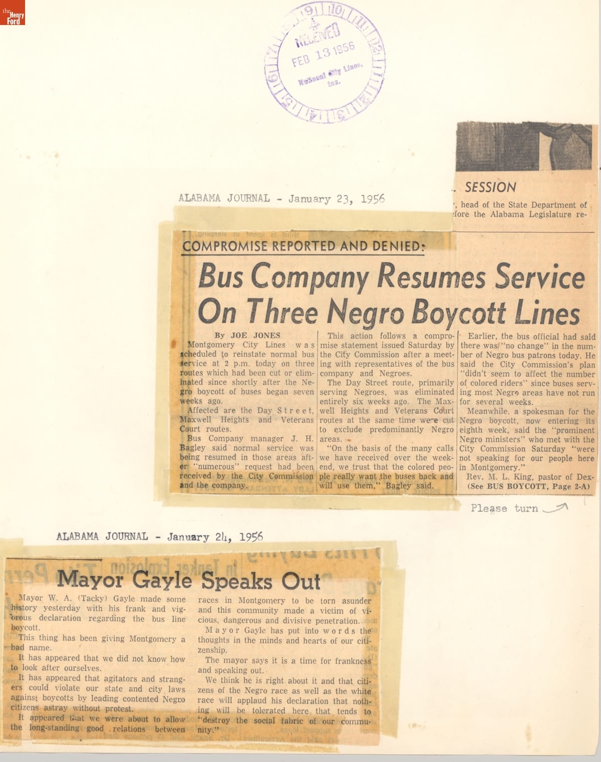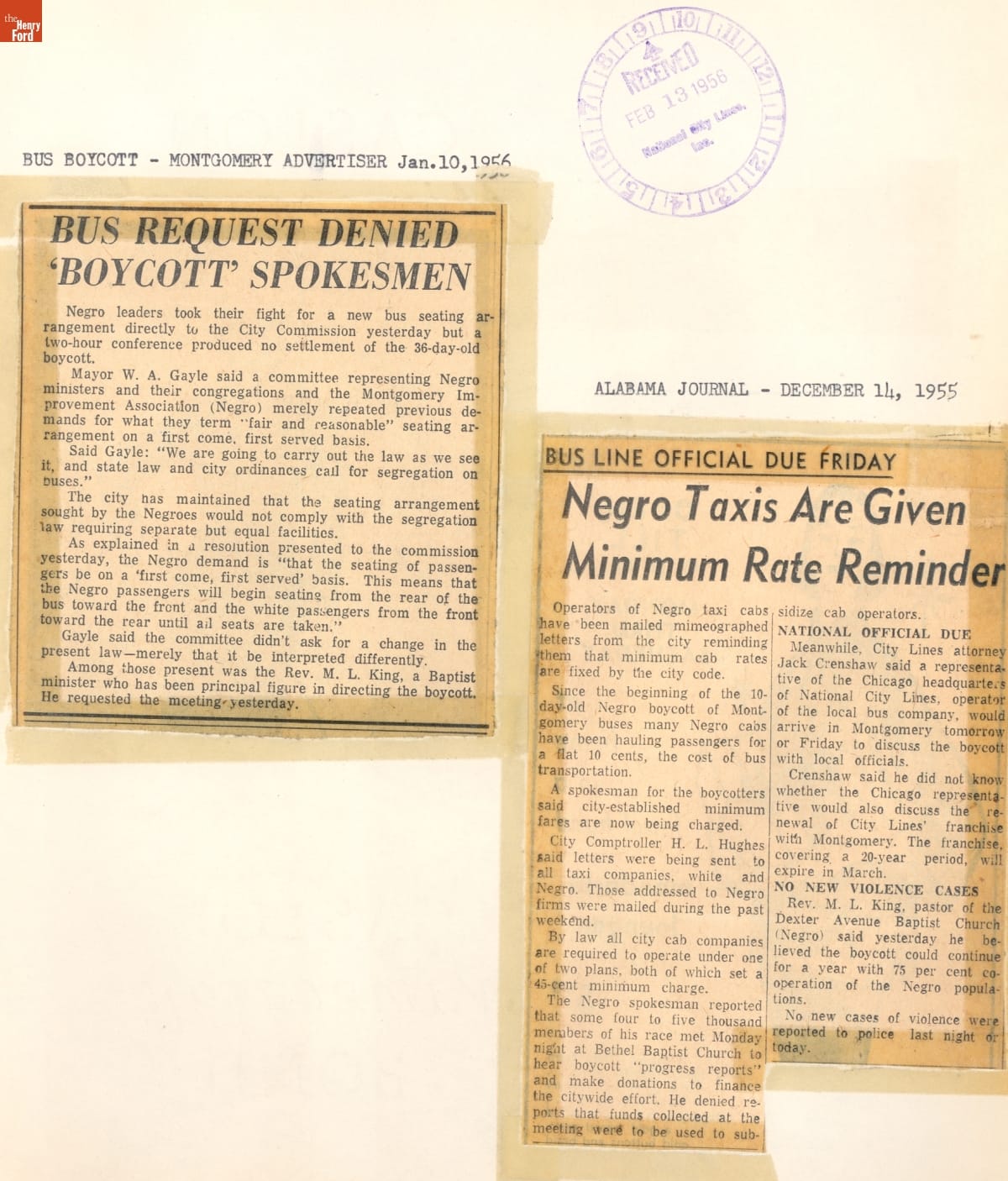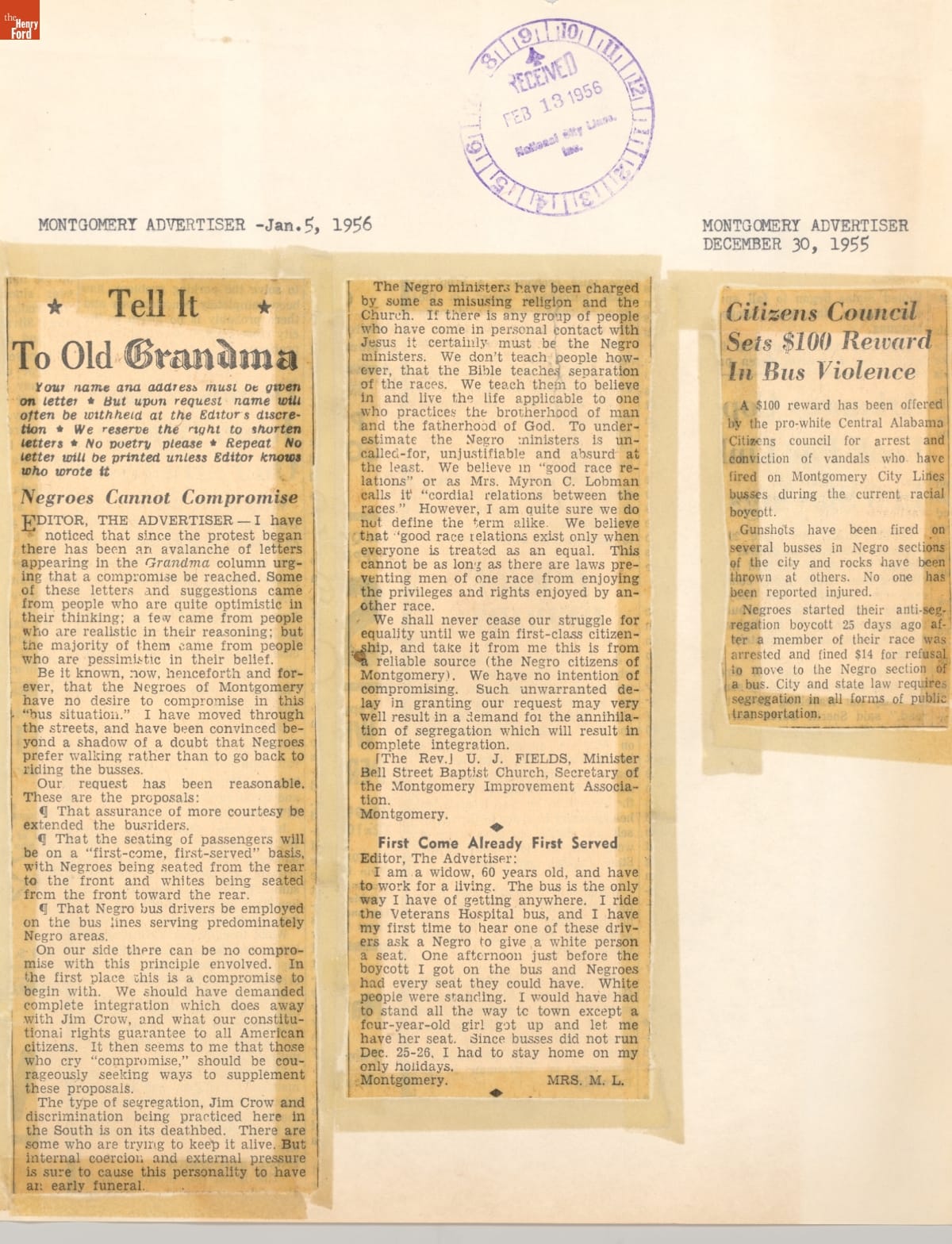 These newspaper articles come from a scrapbook of newspaper clippings saved by Charles "Homer" Cummings, a Montgomery City bus lines manager. Together, these articles recount the story of the 381-day Montgomery bus boycott that was inspired by the arrest of Rosa Parks, who refused to give up her bus seat to a white man despite existing segregation laws.
